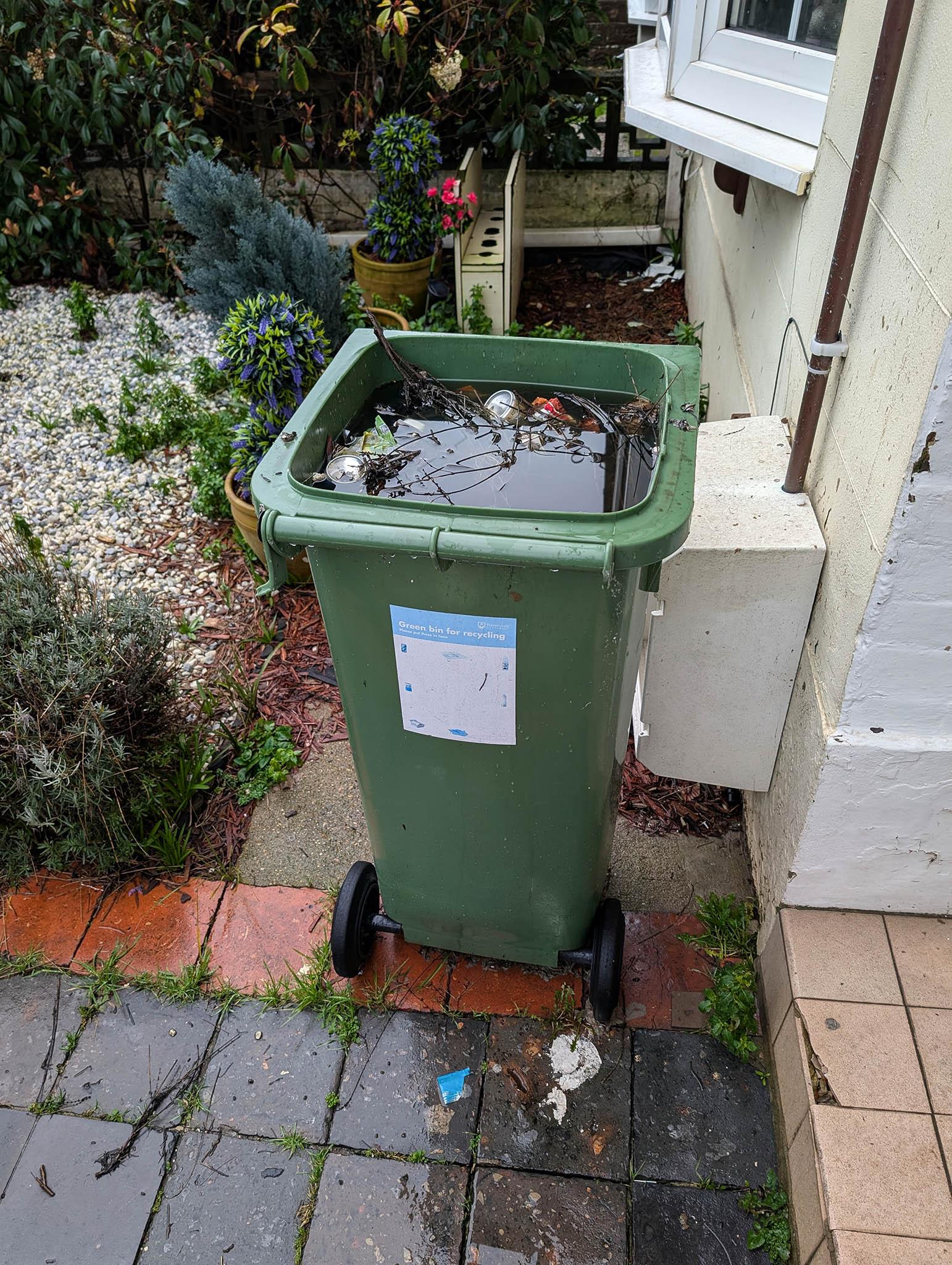 I've mentioned before that our neighbours are morons. I dread to think how many years they've lived here without quite grasping bin schedules and at some point, somehow, probably because they'd overfilled it, their recycling bin lost its lid. It's rained a lot recently and this is the state of their green bin right now. I've parked our car well away from the front of the house because they won't consider it when or if they eventually tip this over to empty it.