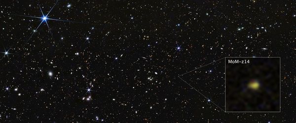 JWST has confirmed this galaxy, MoM-z14, as the most distant one yet studied. We're seeing it as it was 13.5 billion years ago, 98% of the way back to the beginning of time.