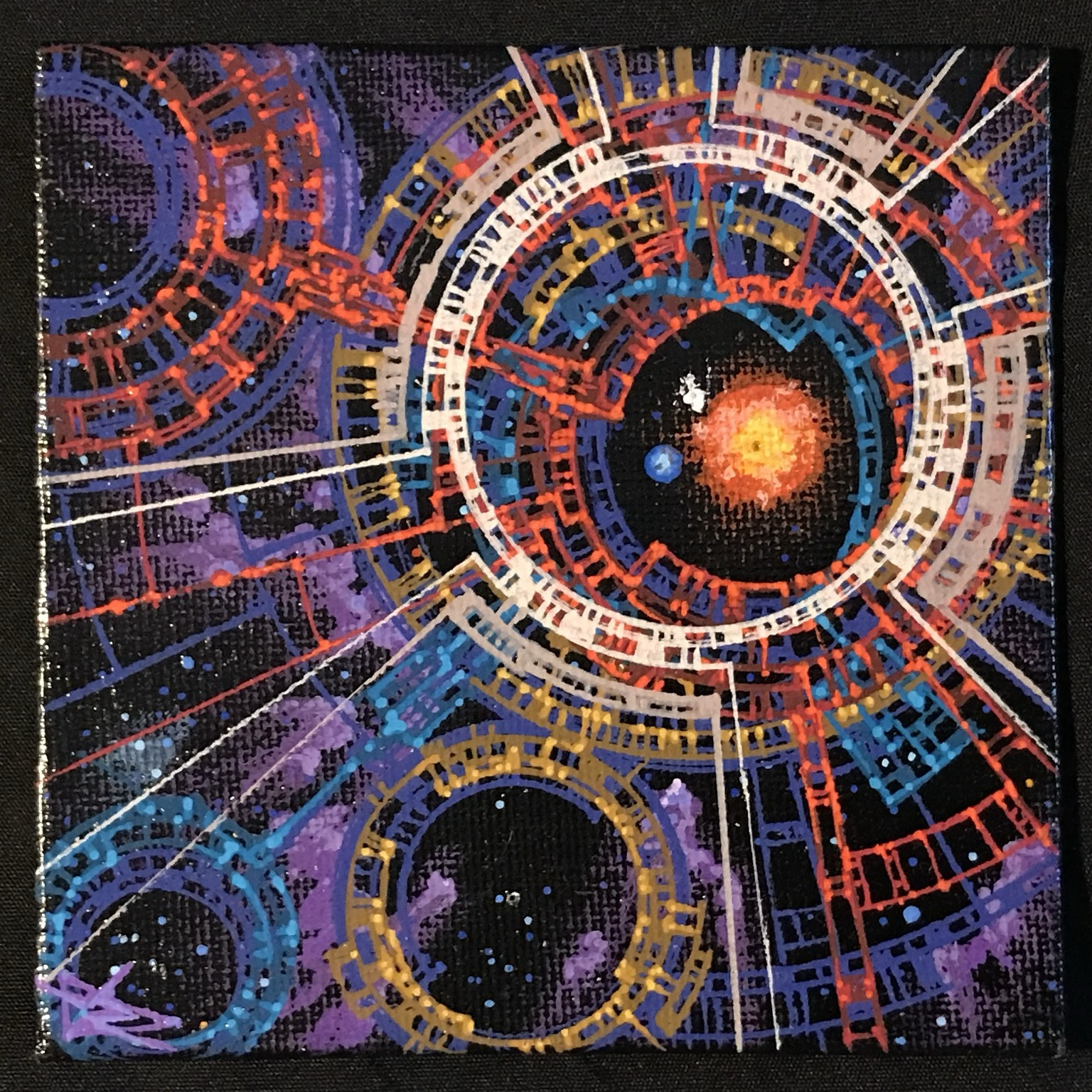 At only $70, this jubilant 4x4” piece on canvas board features a triple system of red, blue and white stars. Are the circles and lines a user interface or tremendous space structures? Message me to get this cosmic view! 😊