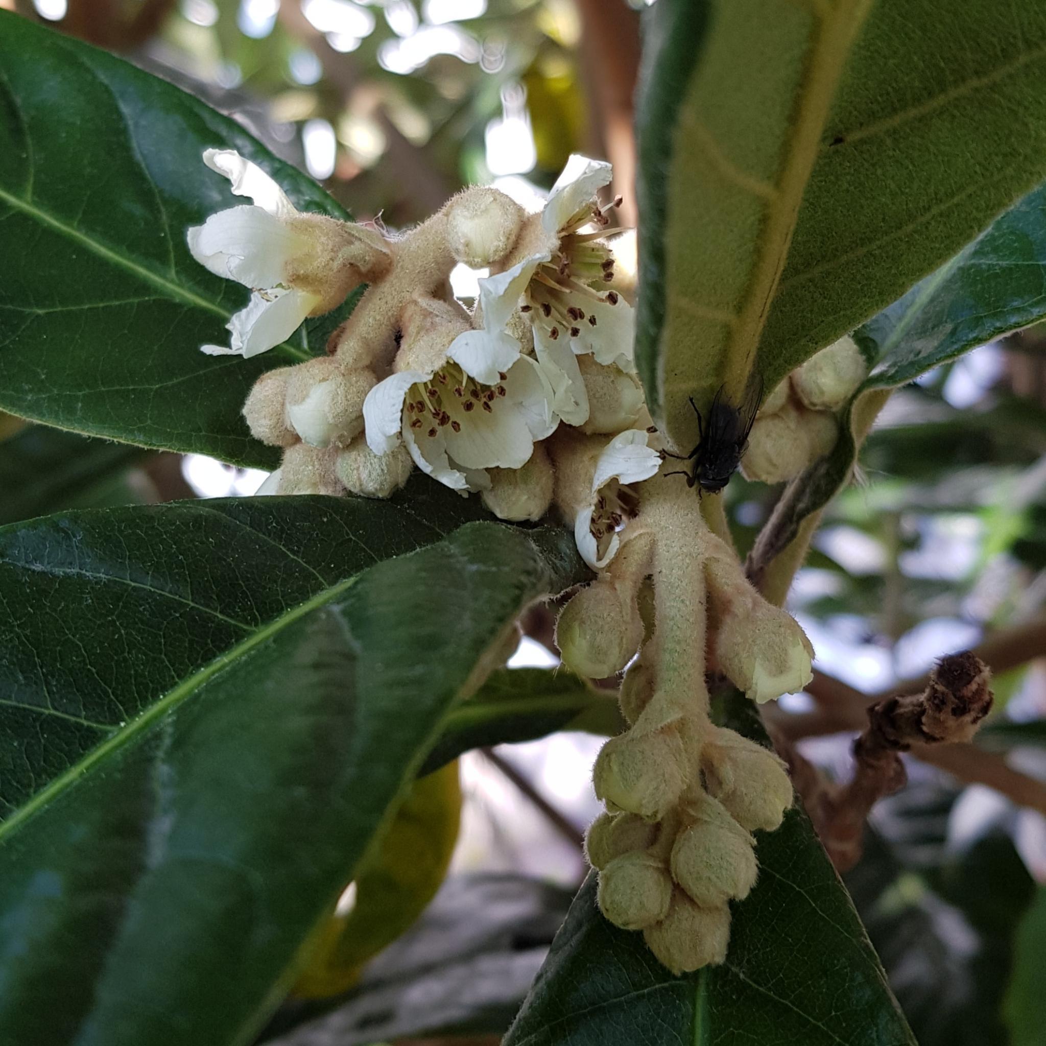 In unserem Garten blüht jetzt im Dezember eine Japanische Wollmispel. Eine letzte müde Stubenfliege, vom herrlichen Duft angelockt, gibt sich redlich Mühe als Bestäuber.