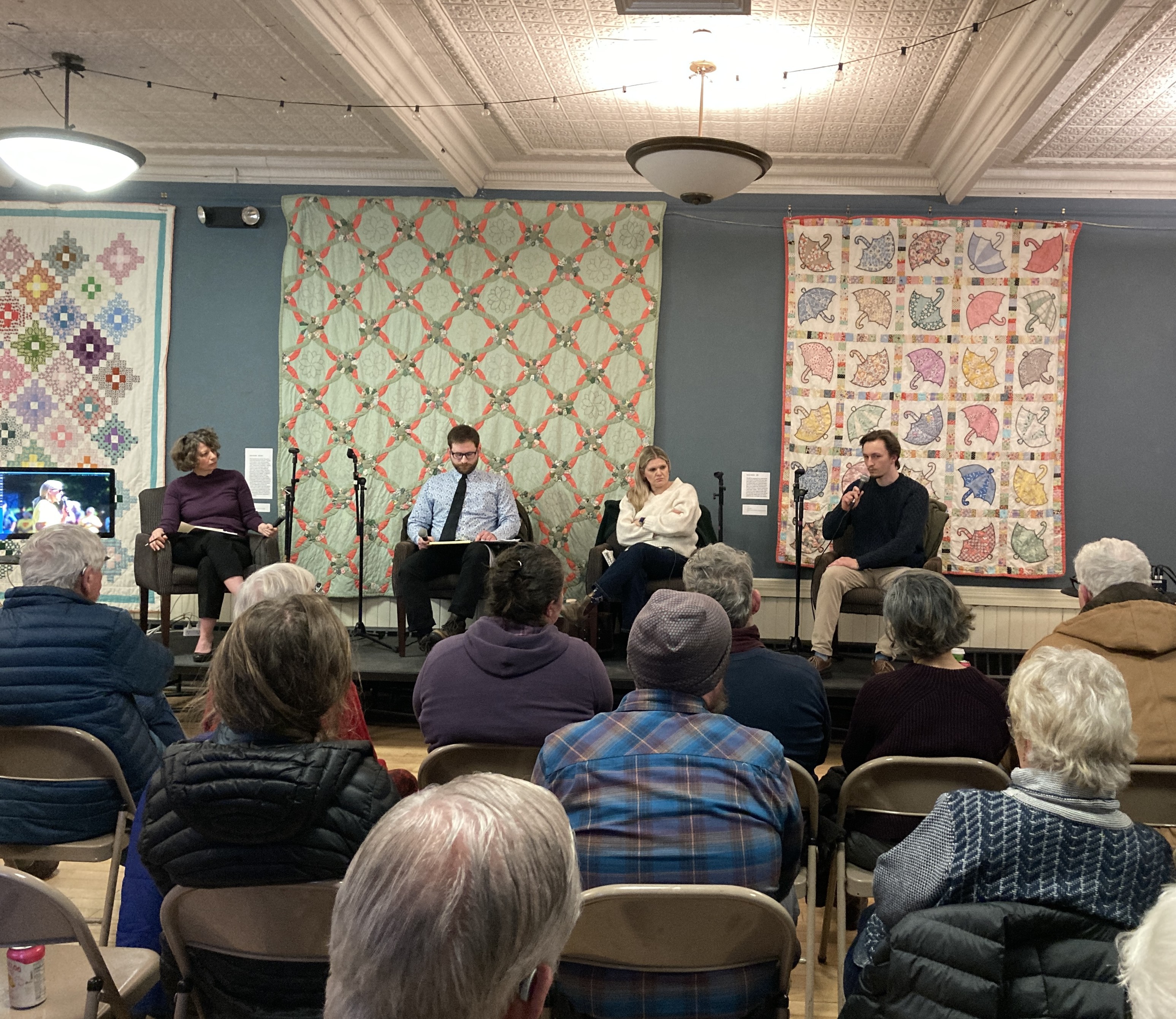 Sunday a team of civics nerds including me worked with the local newspaper (host), the town moderator (moderator), the local music hall (venue) and the local public access channel (streaming) and organized a Selectboard candidate forum with the four people running for two seats. 100 people showed up either in person or online. Additional bonus of a quilting exhibit happening at the venue meant all the photos look cool. It was tedious work getting it all set up but very very worth it. #Vermont