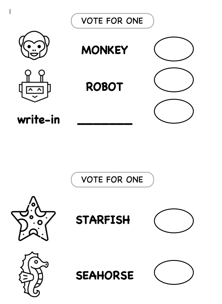 Town Meeting day and local elections are coming up. I'm the co-chair of the Board of Civil Authority and, along with the Town Clerk, we run elections. In order to try to make voting more accessible and less onerous (and to get younger people vaguely interested in the process), we have a Kid Table where parents can park their kids while they vote with sample ballots and coloring pages. Here are this year's contests. Past contests included dog vs. cat and pie vs. creemee. #vermont