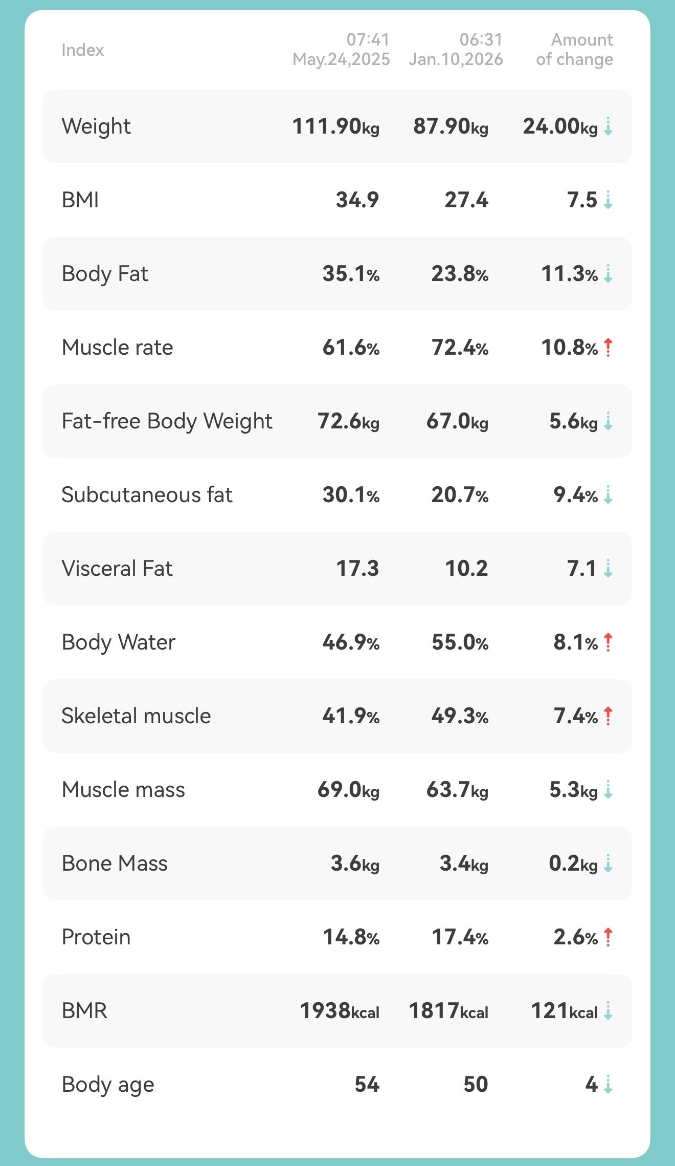 Overall Summary You’ve lost 24 kg (over 52 lbs), significantly reduced body fat, and improved muscle quality and hydration. This isn’t just weight loss—it’s a shift toward a healthier, more metabolically efficient body.