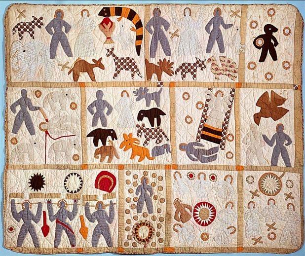 Harriet Powers (1837-1910) learned to sew while enslaved in Georgia. After the Civil War, she and her spouse owned a farm, but financial difficulties forced her to sell the quilt shown (for $5!) She is known to have made many quilts with religious and astronomical themes, though only two of her works have survived.