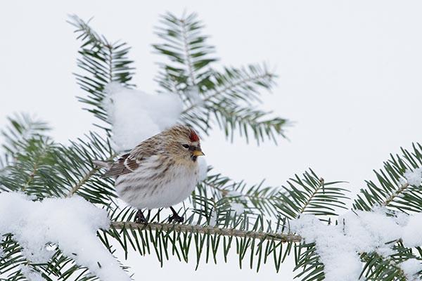A Common Redpoll on a snowy branch by Jan Luit