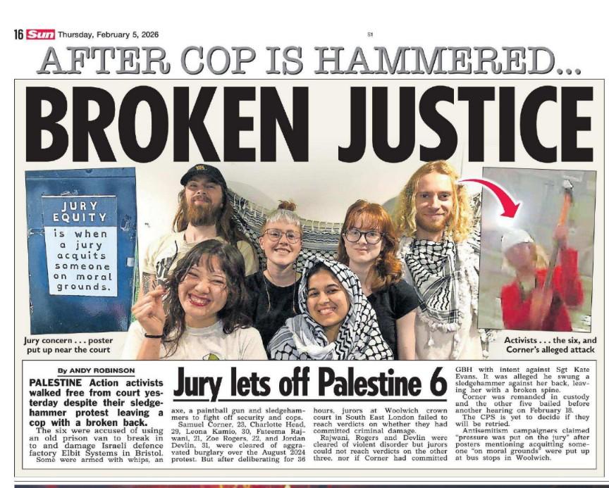 Utterly sickening article in the Sun smearing the Palestinian 6 as going into an Elbit factory armed to attack cops and security guards.