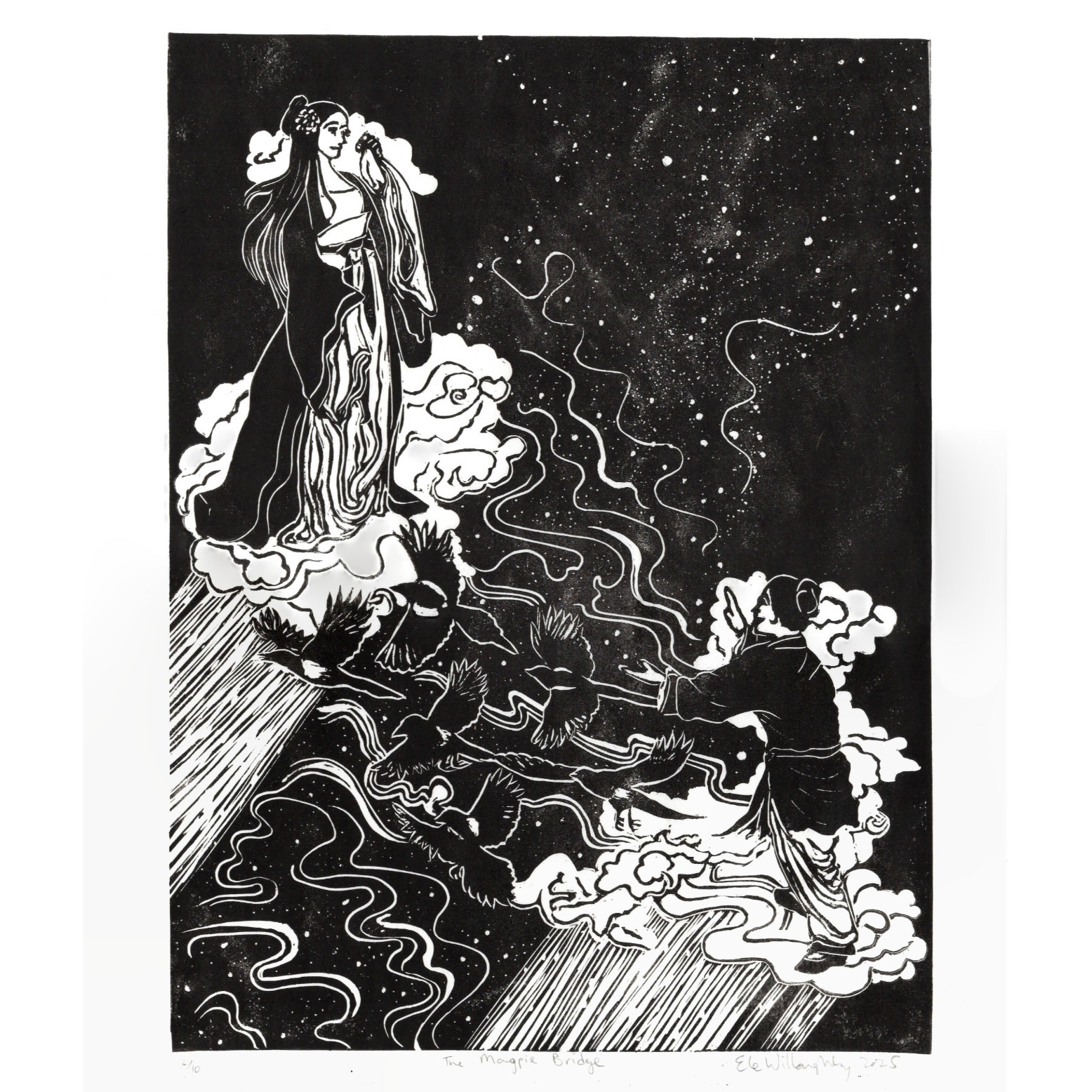 Day 23 #artAdventCalendar is My hand-carved, hand-printed lino block print of the well-known, ancient Chinese folktale of the magpie bridge linking the lovers, The Weaver Girl & the Cowherd, separated by a great river, which is the Milky Way, is printed on lovely Japanese paper.