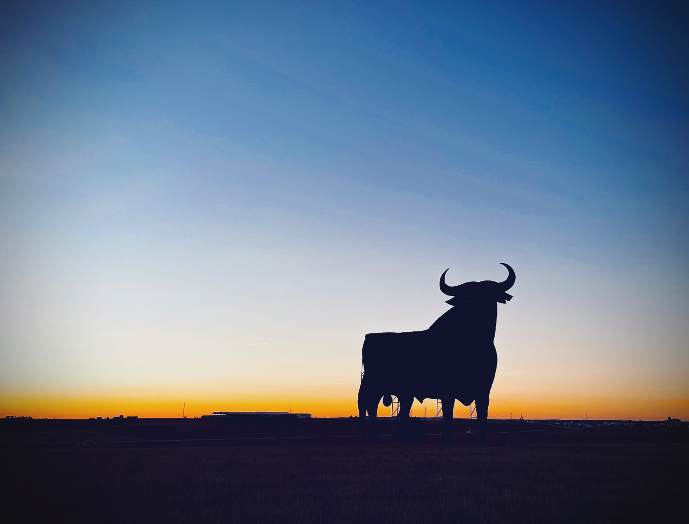 The famous Osborne bulls that you can see on the roads of Spain. Sunset.