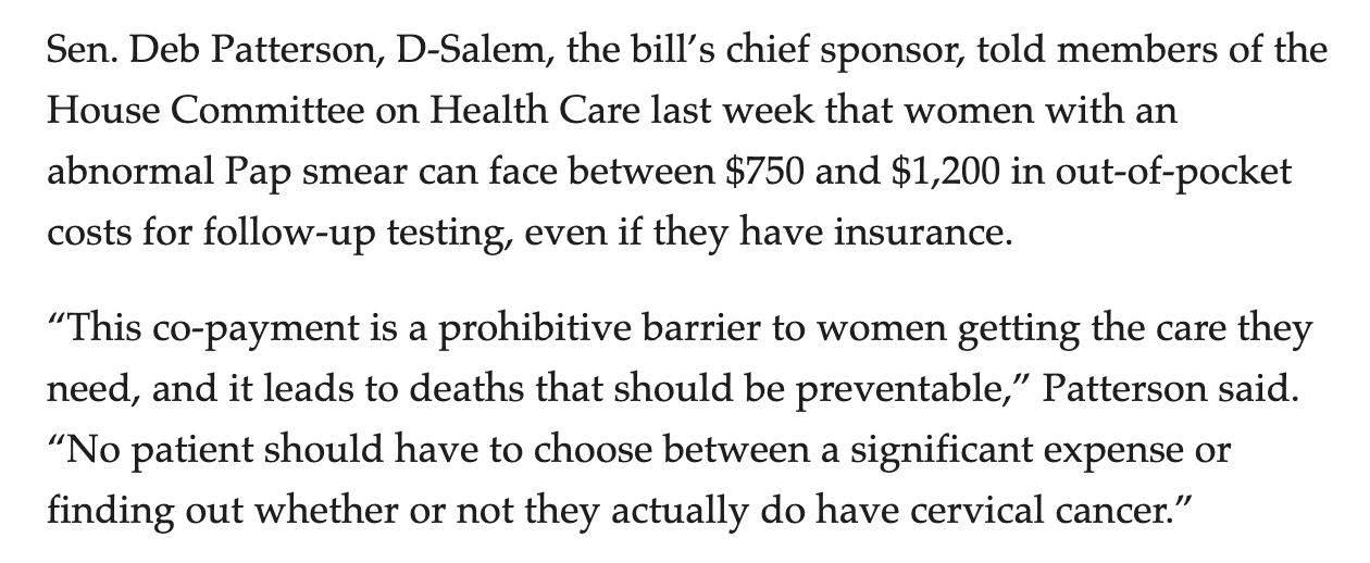 "Oregon is poised to become the first state in the nation to eliminate out-of-pocket costs for follow-up testing after an abnormal cervical cancer screening."