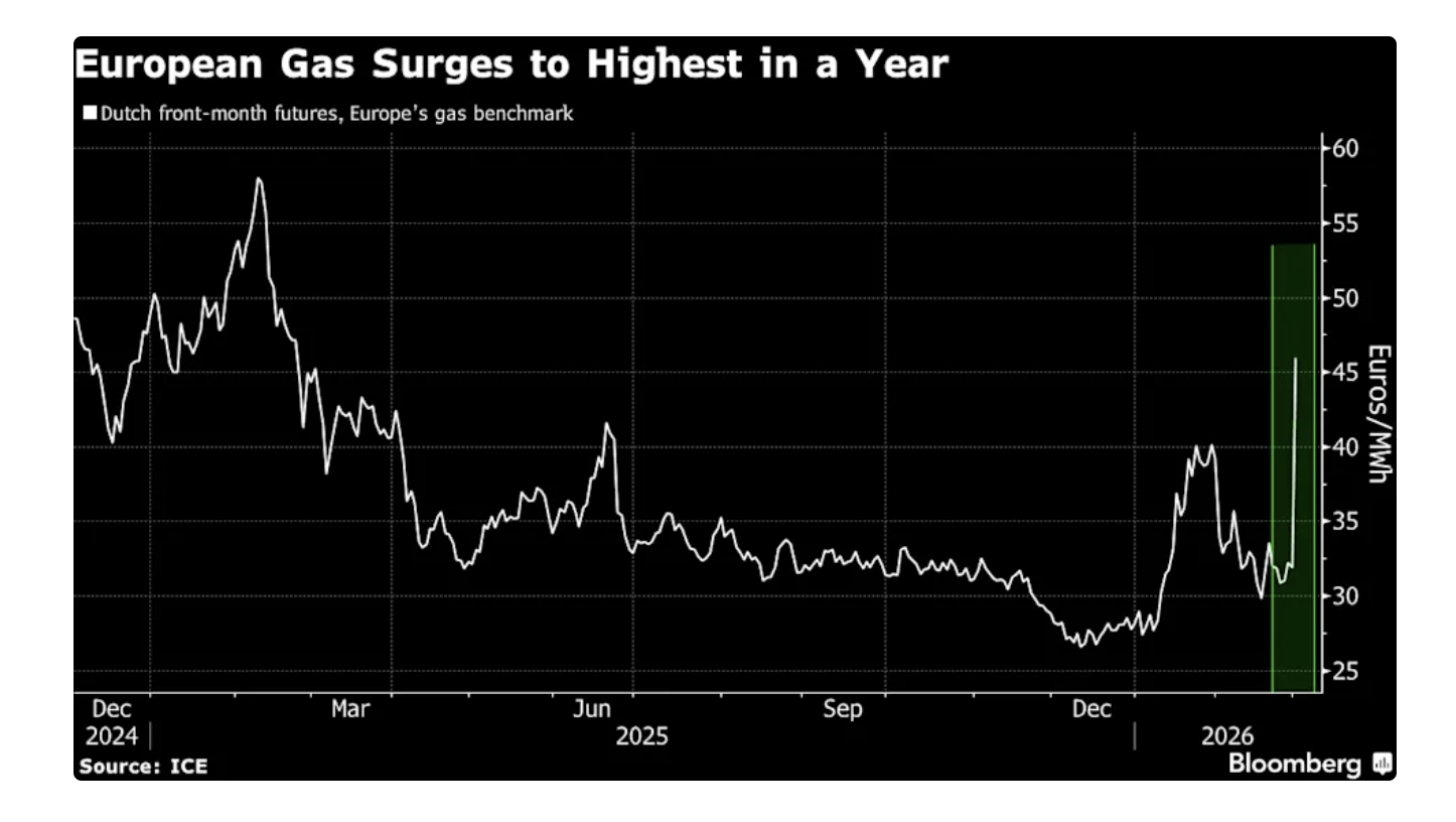 #Qatar shut #LNG production at the world’s largest export facility after it was targeted in an #Iranian drone attack, sending European #gas prices surging as much as 54%, chart @yahoofinance.com
