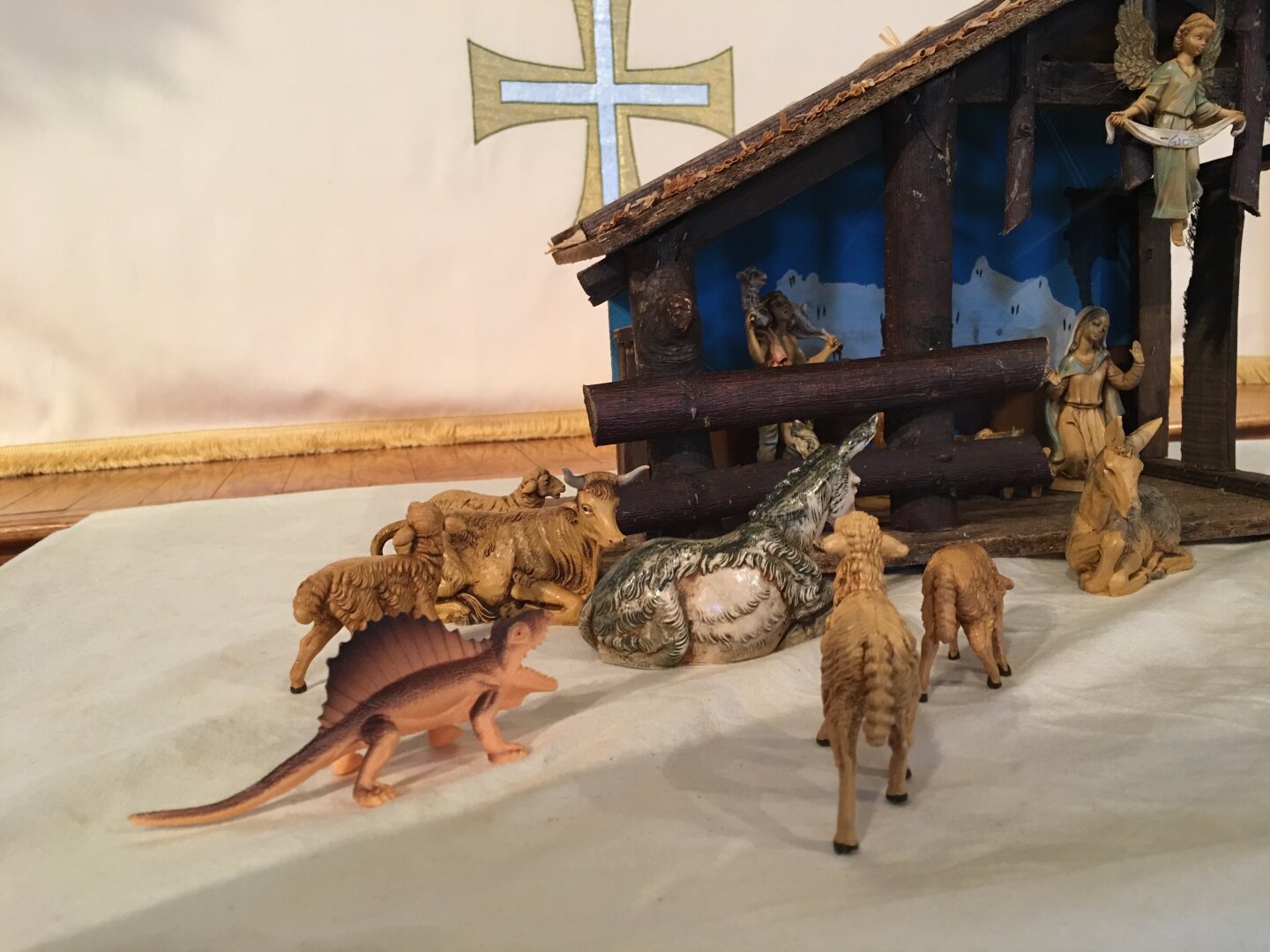 We used to do this thing where we gave the children who showed up for the Christmas Eve service animals from the nativity scene and invited them to join the procession and place them around the manger. I would be at the end of the procession to place the Christ child, after which I would cense the scene and say the opening prayers. But one year I see a little rubber dinosaur toy among the sheep and donkeys. I pulled out my phone to take a pic and mentioned it to the congregation. No one ever admitted to doing this, but the dinosaur became a fixture at the crèche every year from that point forward. Kids would sometimes clamor to be the ones to carry it.