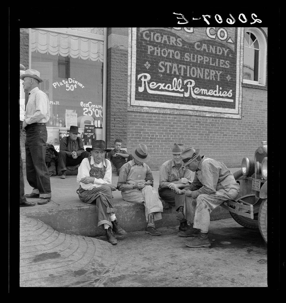 Williamette Valley hop farmers in town hold their political forum on drug store corner. Independence, Oregon