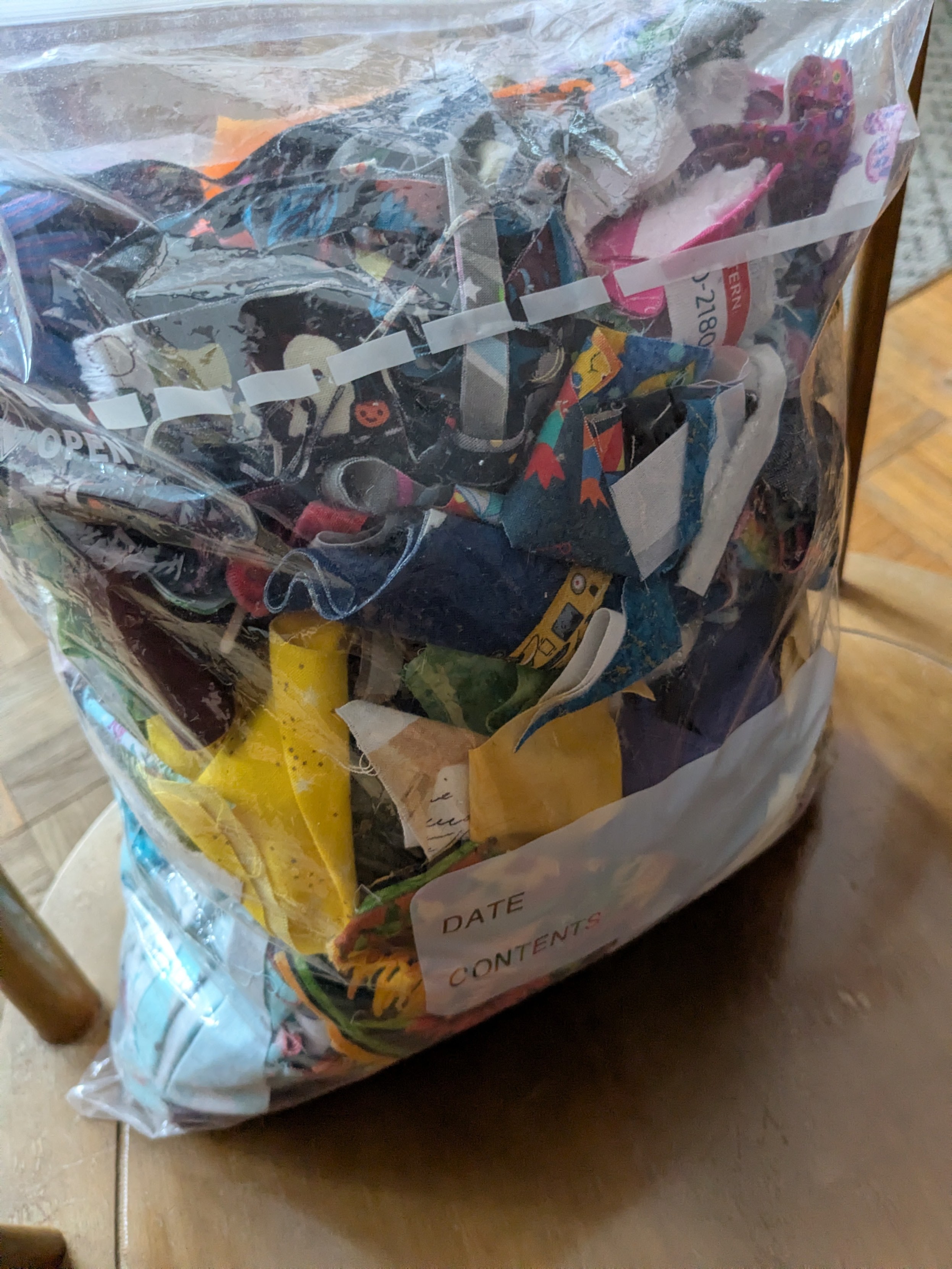 I hate to see fabric scraps go landfill, so when a kindergarten teacher asked me for some, a few years ago, I overdid it with several big bags, I've been giving them to kindergarten ever since. I dropped a bag off this morning. Reuse! It is much easier to decide if a scrap is worth keeping, when you know it is moving to another artist.