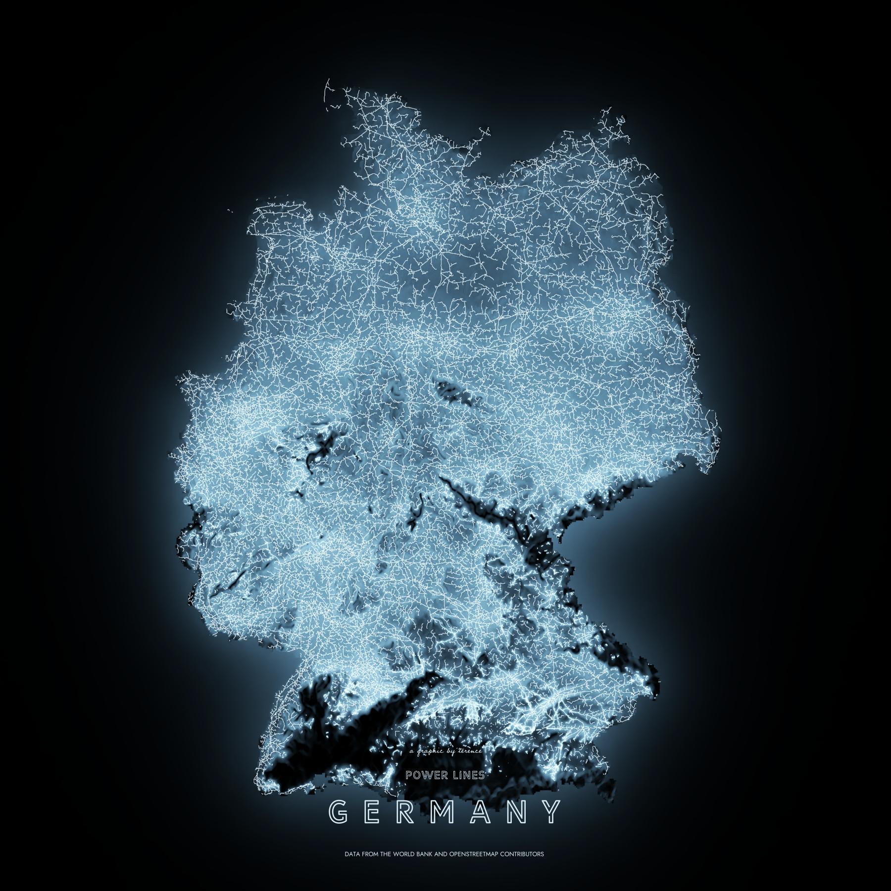 Power lines of Germany revisited, this time showing both OSM and derived power lines.