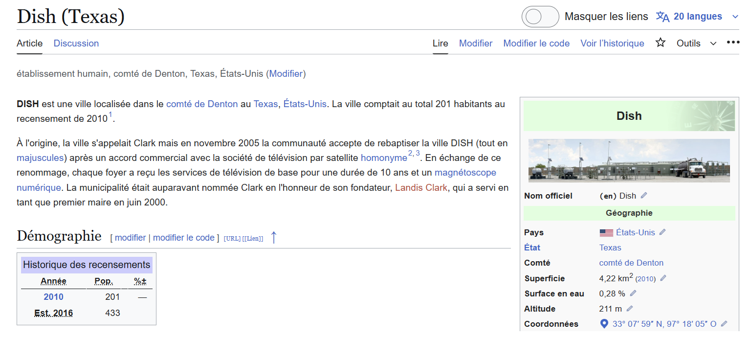 Le saviez-vous ? En 2005, la ville de Dish (Texas) changea son ancien nom en échange de services de télévision de base pour une durée de 10 ans et un magnétoscope numérique par foyer après un accord commercial avec la société homonyme 🤨.