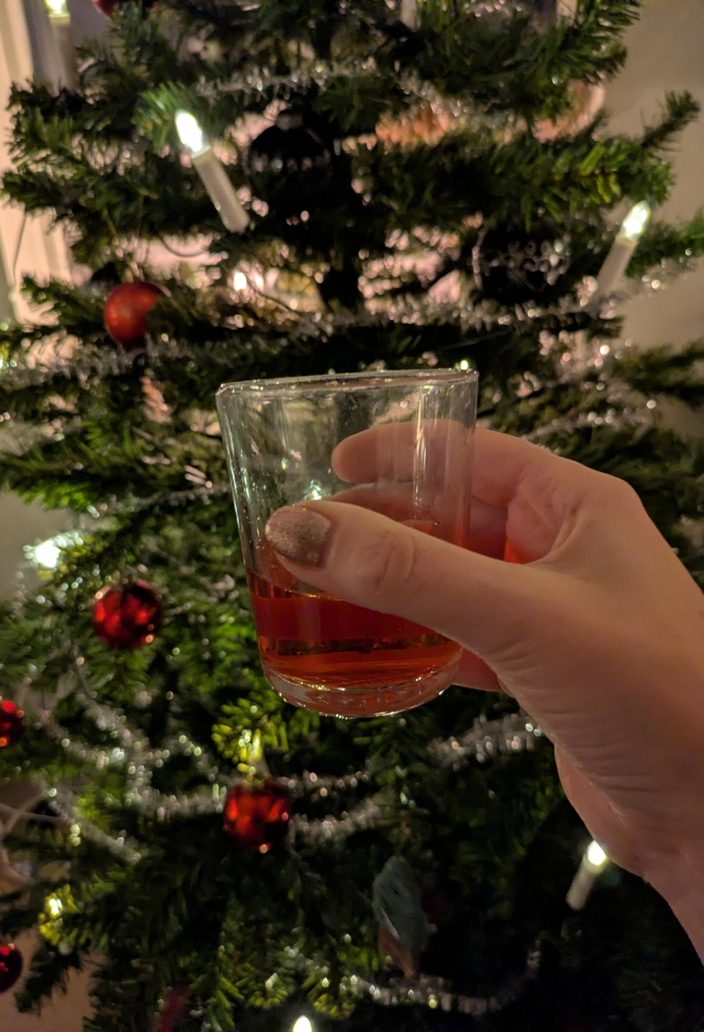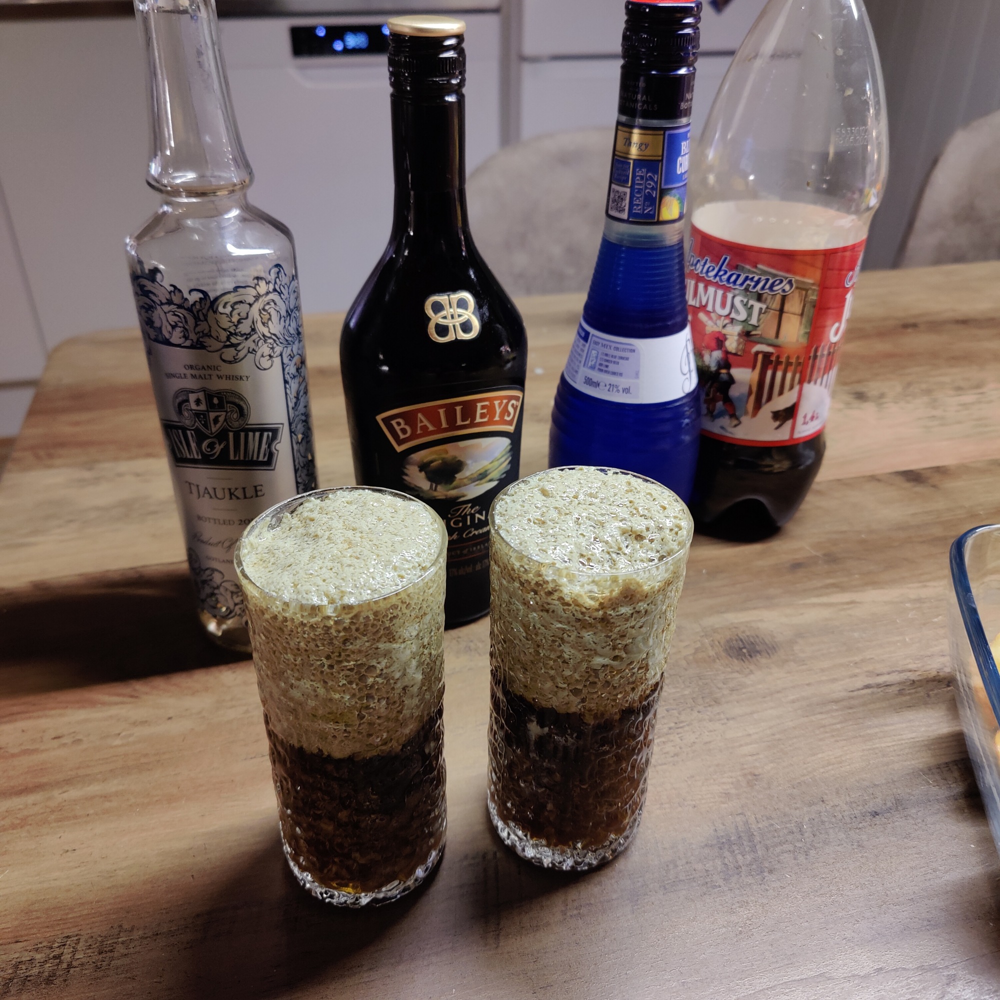 God jul #drinkklubben 🎄 Idag bjöd jag @emwlll.bsky.social@bsky.brid.gy på Grovspol: 3 cl whisky 4 cl Baileys 2 cl blå curacao Fyll upp med cola (idag julmust)
