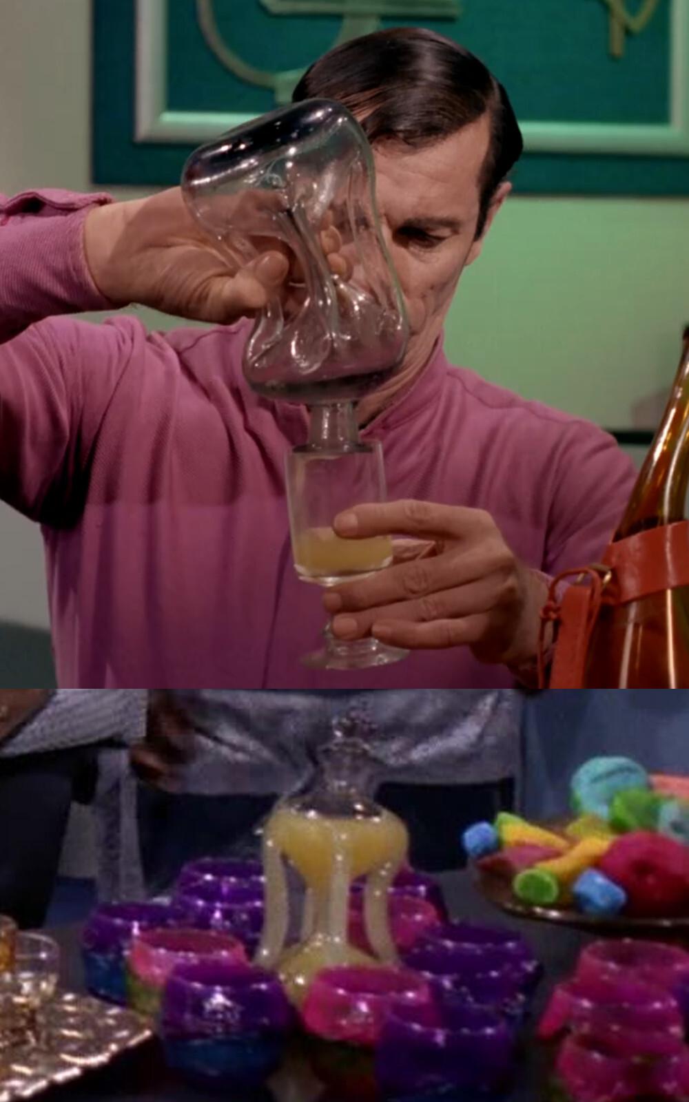 Scotty and Tomar drink a yellow alcoholic beverage from the Kluk Kluk bottle in the #StarTrekTOS' episode "By Any Other Name"⬆️. I suspect this is the same beverage that already was in the bottle in "Journey to Babel"⬇️ (and enjoyed by the Andorians) a few episodes earlier. 2/4