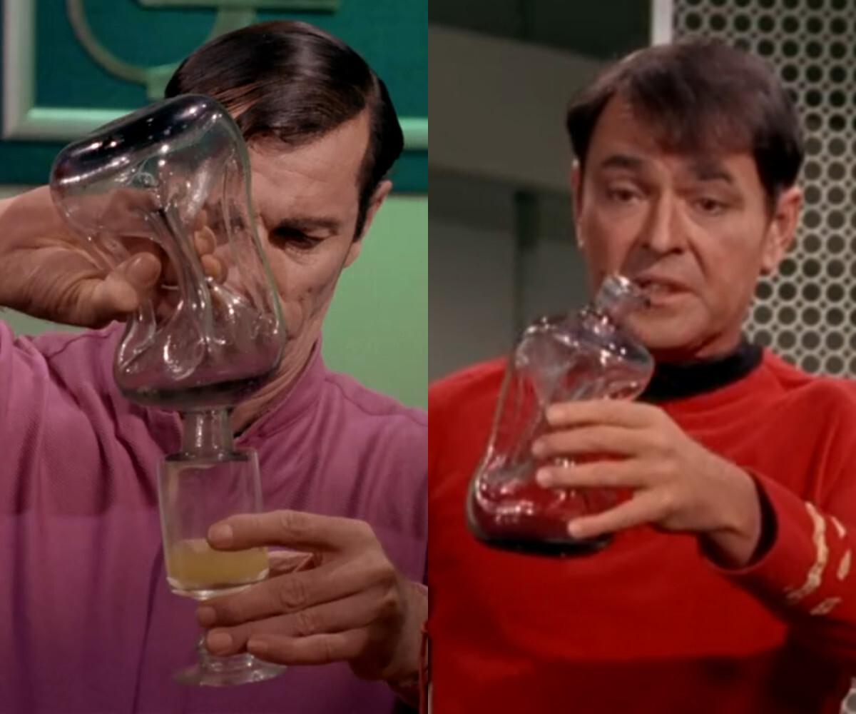 The second alcoholic beverage that Scotty and Tomar try out in #StarTrekTOS' "By Any Other Name" comes in a drunken (slightly bent) Kluk Kluk bottle (by Holmegaard). As can be seen, the bottle is emptied pretty quickly. 🧵 1/4