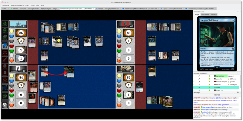 🕶️ A view of its UI during a 4-player online game (of Magic: The Gathering) I attended as a spectator. The main part of the UI is divided into 4, showing for each player the cards placed on the mat and its parameters. On the right-hand side of the UI, several zones (which can be detached from the UI), including Card Info (the spectator can select a card on the mat with a mouse hover to read it better), Player List (selecting a player also opens a menu with actions on that player, such as chat, add to friends list, view games, etc.), Messages (from the UI specifying player actions). At the top of the UI, tabs allow you to build a Deck by selecting cards online, view Servers by game type, view Replays, attend (and participate in?) several games simultaneously.