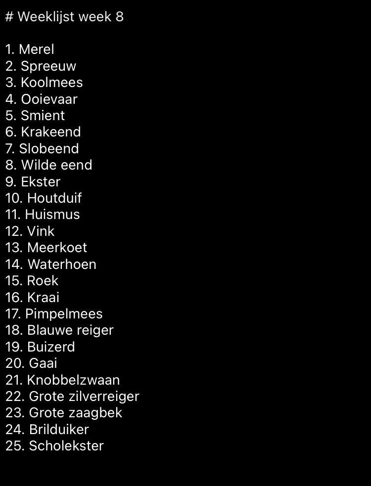 Gisteravond vergeten te posten, dus nu nog even. Mijn lijstje vana afgelopen week met de verschillende vogels die ik heb gezien. Minder lang dan die van vorige week, maar het was ook én een hectische week én deze keer zijn ze allemaal van binnen een straal van twee kilometer rond ons huis: