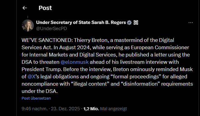 Hier noch die offizielle Mitteilung aus dem Weissen Haus: https://www.state.gov/releases/office-of-the-spokesperson/2025/12/announcement-of-actions-to-combat-the-global-censorship-industrial-complex/