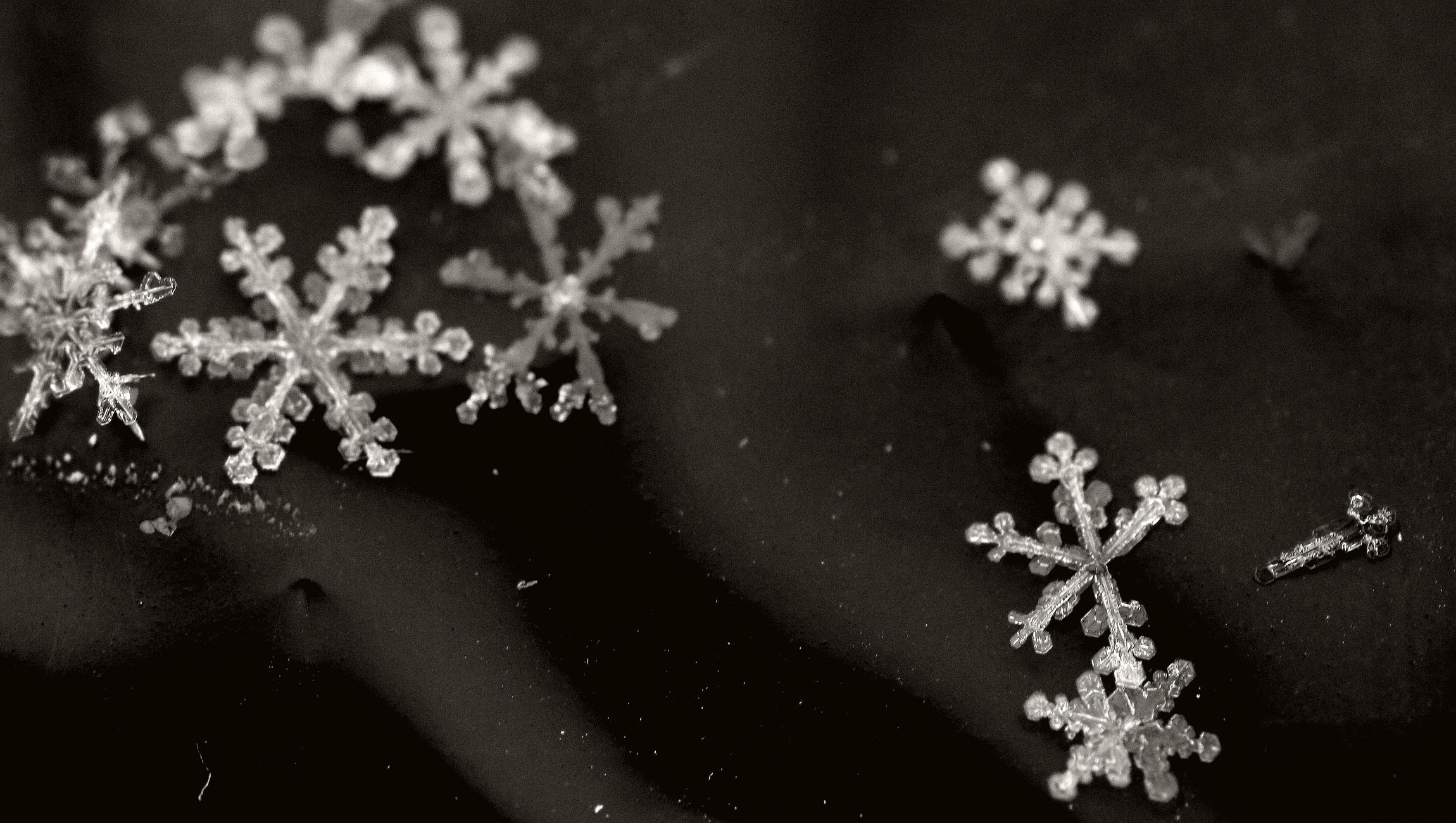 Photographie macro en noir et blanc avec une légère teinte sépia d'un flocon de neige très délicat à la symmétrie parfaite se tenant droit sur une pile d'autres flocons blancs dans le bas de la photo, et se détachant sur un fond gris foncé dans le haut de la photo.