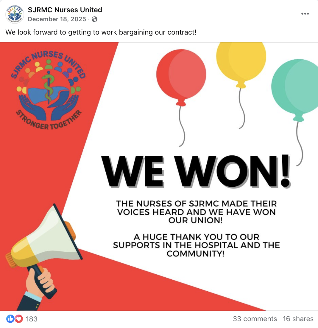 Image of a social media post. Graphic with red background and a hand holding a bullhorn with balloons rising above it, and there is black text that says We Won! The Nurses of SJRMC have made their voices heard and we have won our union! A huge thank you to our supports in the hospital and the community! The post says we look forward to getting to work bargaining our contract.
