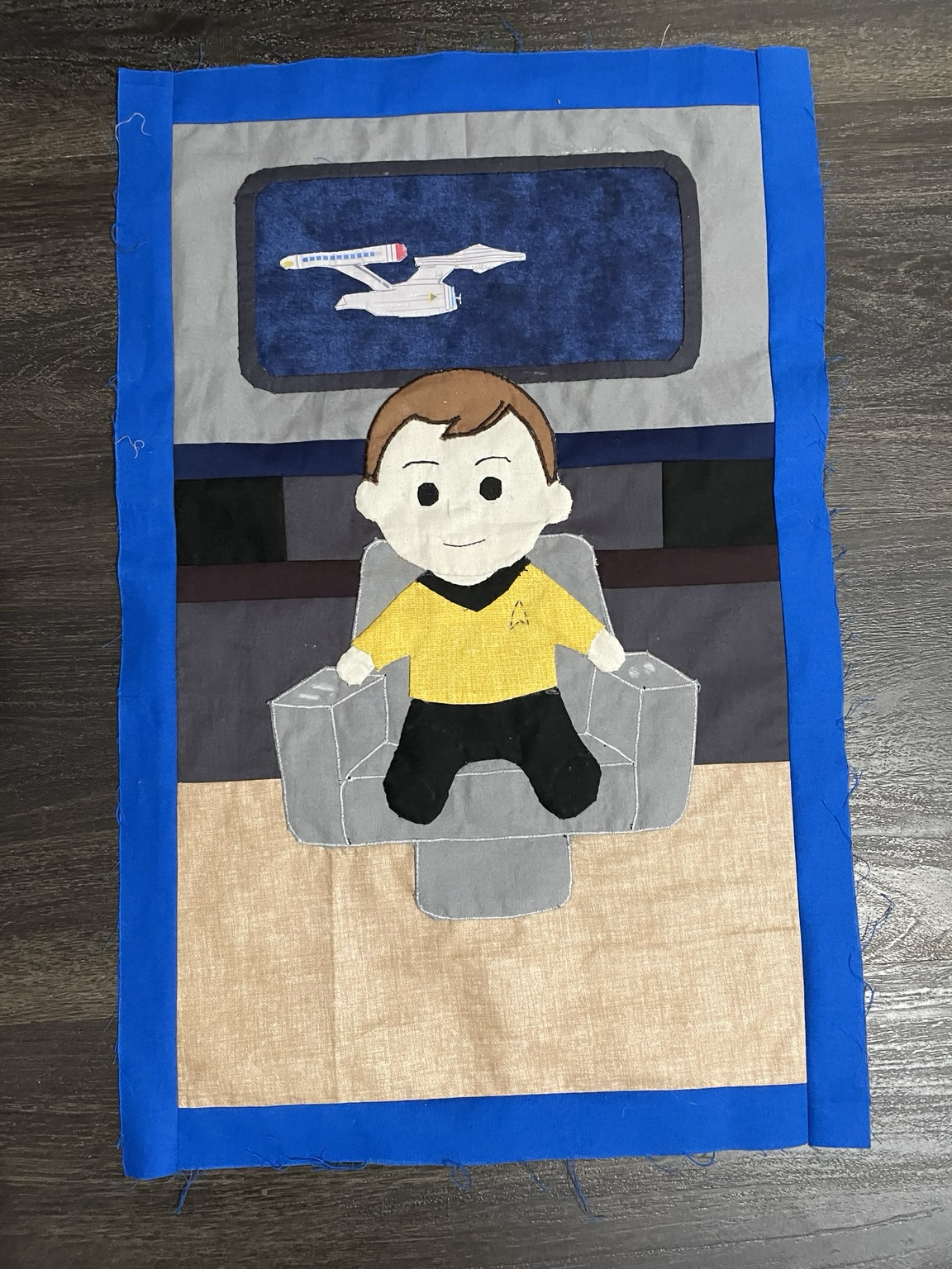 I’m making slow progress. This is a little out of my comfort zone. Making people is hard. I’m hoping my baby Kirk doesn’t look too weird/ odd. LOL. I’m trying to figure out the best way to put buttons on the arm rest of the chair. I’m thinking thread buttons. #startrek #quiltrunner