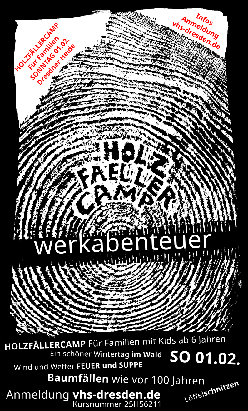 ✏️ Anmeldung: https://vhs-dresden.de/kurs/kinder-jugend-und-familie/familien-und-eltern-kind-kurse/gestalten/holzfaeller-camp-in-der-dresdner-heide-mit-kindern-ab-6-jahre/25H56211