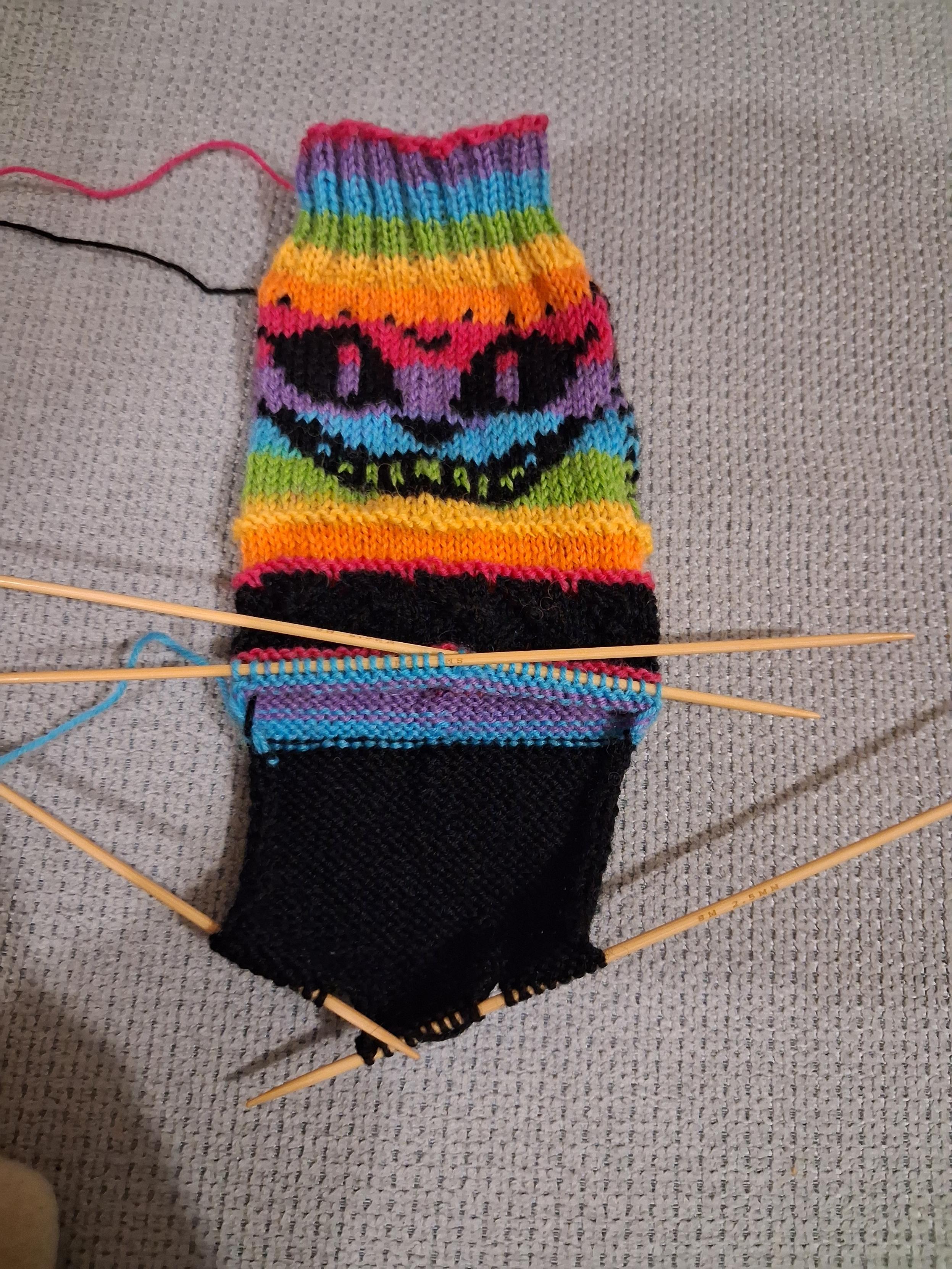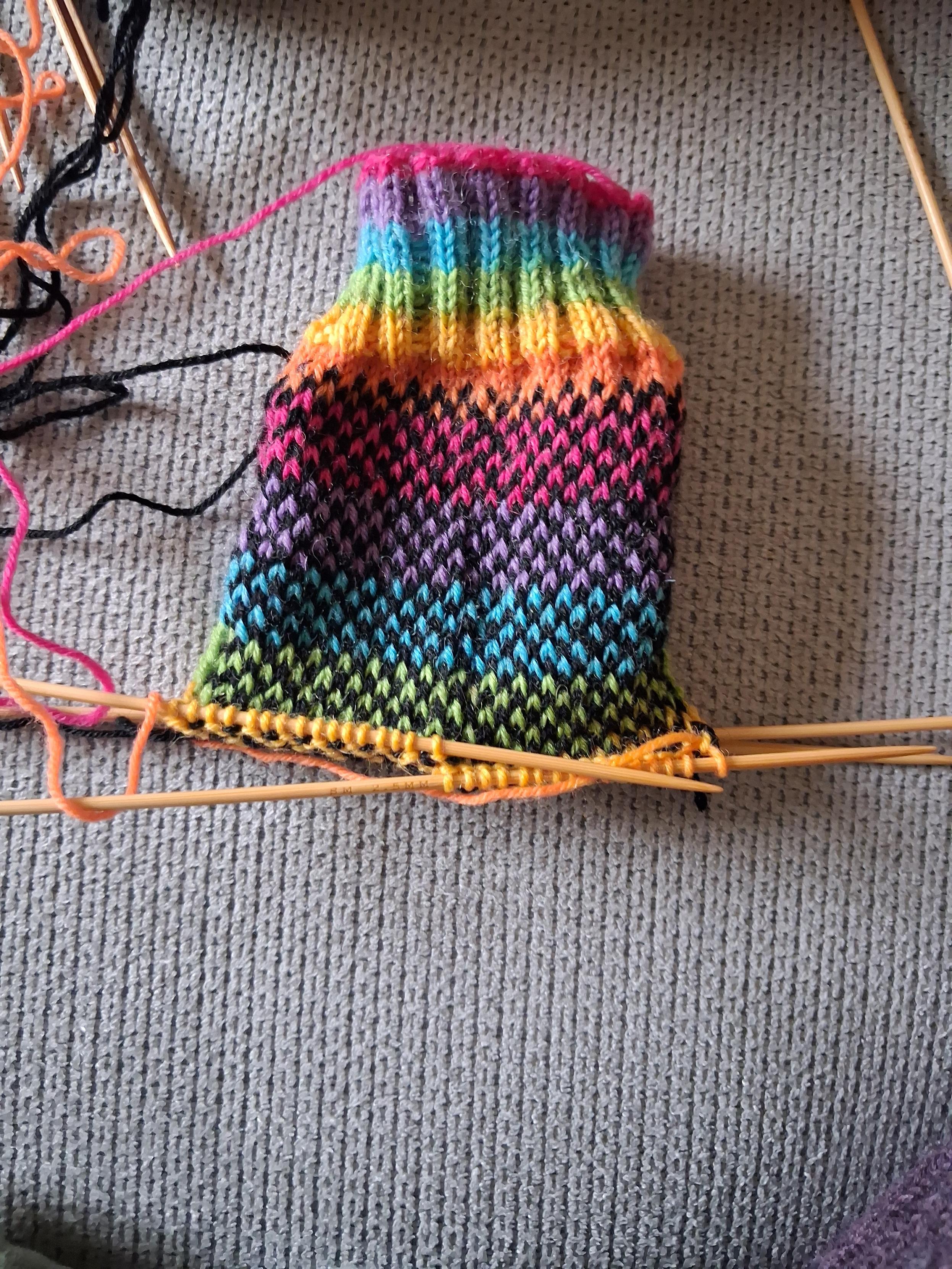 Semaine 3 : Le jacquard est fini. J'aime bien les chaussettes haute alors j’ai choisi la troisième option pour allonger la jambe de la chaussette : huit tours d'arc en ciel puis de la dentelle en noir. J’en suis seulement au deuxième tours d’arc en ciel.
