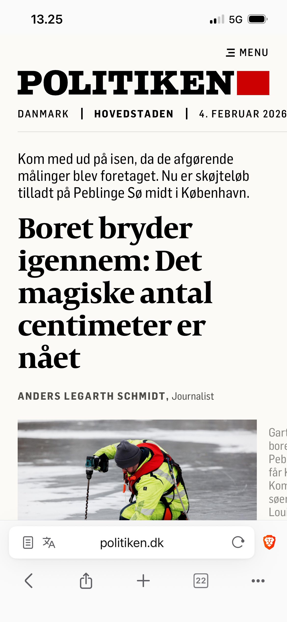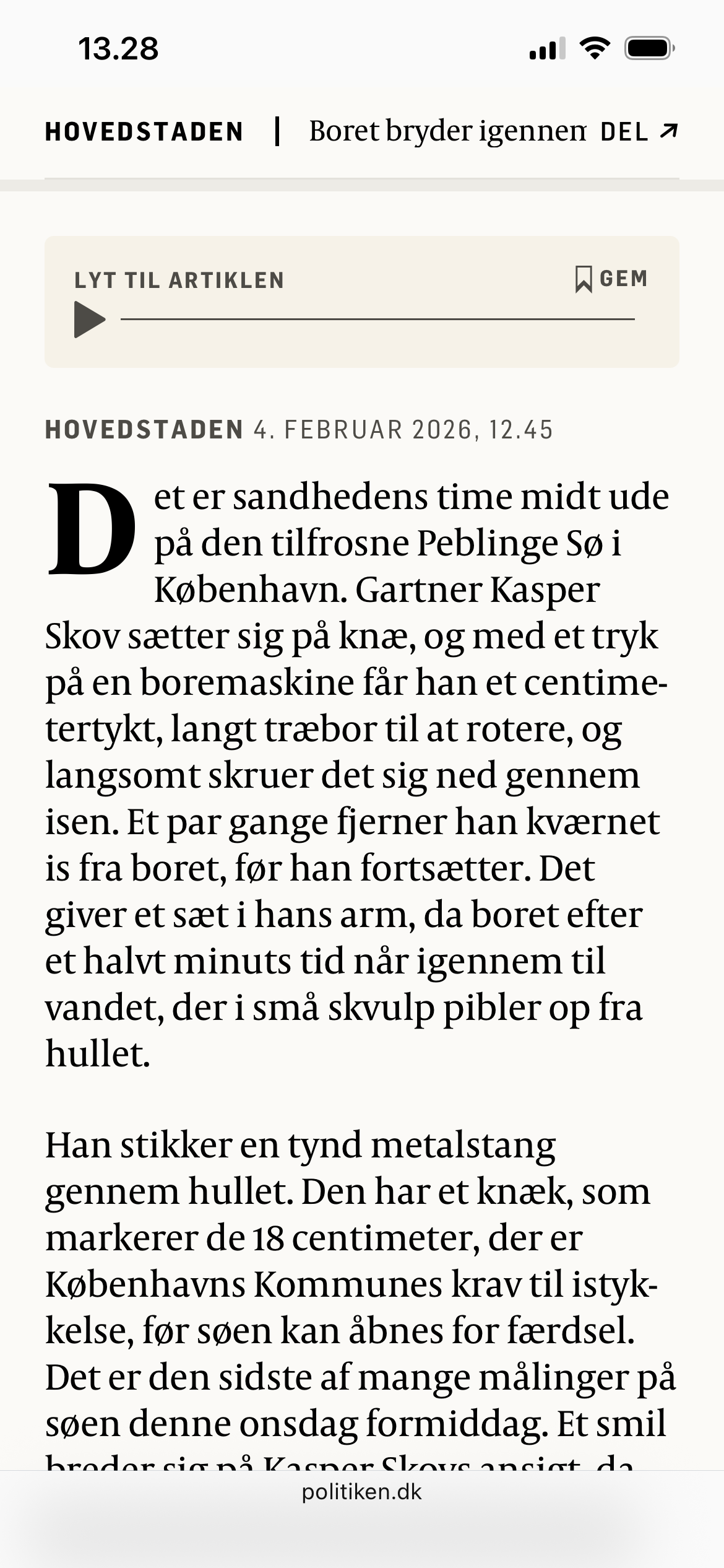 🇩🇰 Ok, der er Jesu genkomst, og så er der Politiken, der måler istykkelse på Peblinge Sø. "Gartner Kasper Skov sætter sig på knæ og med et tryk på en boremaskine..." 😅