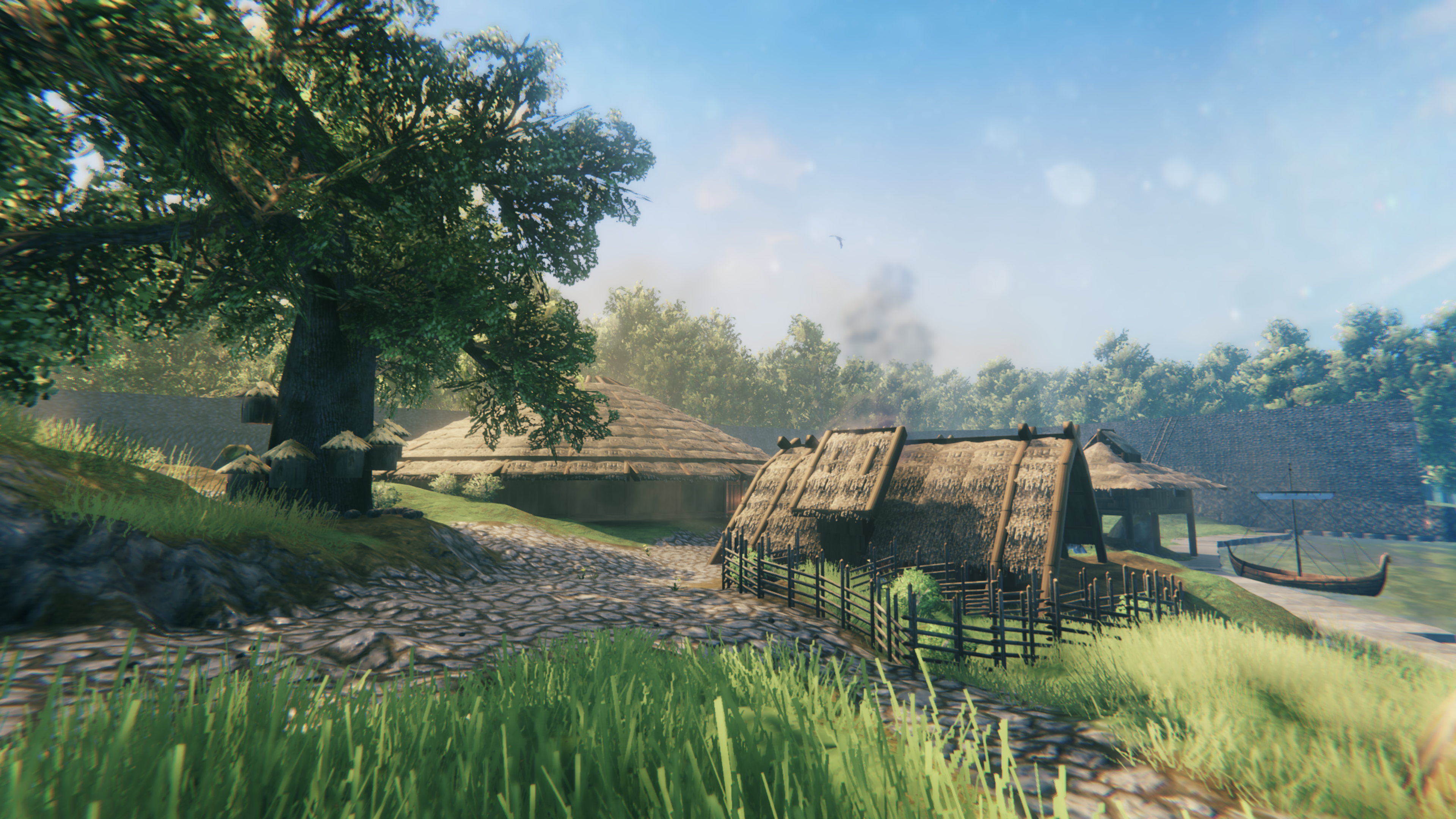 Here's a look at some of the other structures that have been built within the walls of Törshavn. There's @si_fuller's arena with two practice dummies. The piggery, which auto-slaughters boar. We have a bath house on the waterfront. A cobblestone road runs the length of the village from the west gate to the north gate. We have several bee hives on the oak tree in the centre of town.