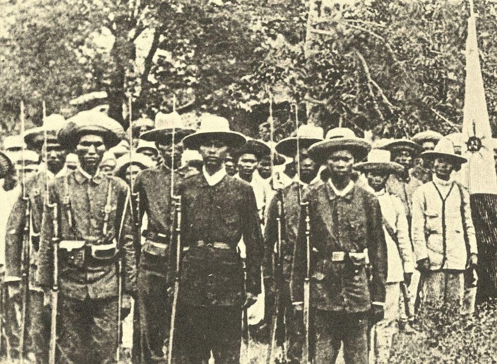 A late 19th century photograph of Filipino Katipuneros, with rifles with fixed bayonets, wearing broad-rimmed hats. By Original uploader was Saluyot at ilo.wikipedia - Transferred from ilo.wikipedia; transferred to Commons by User:DieBuche using CommonsHelper., Public Domain, https://commons.wikimedia.org/w/index.php?curid=10282344
