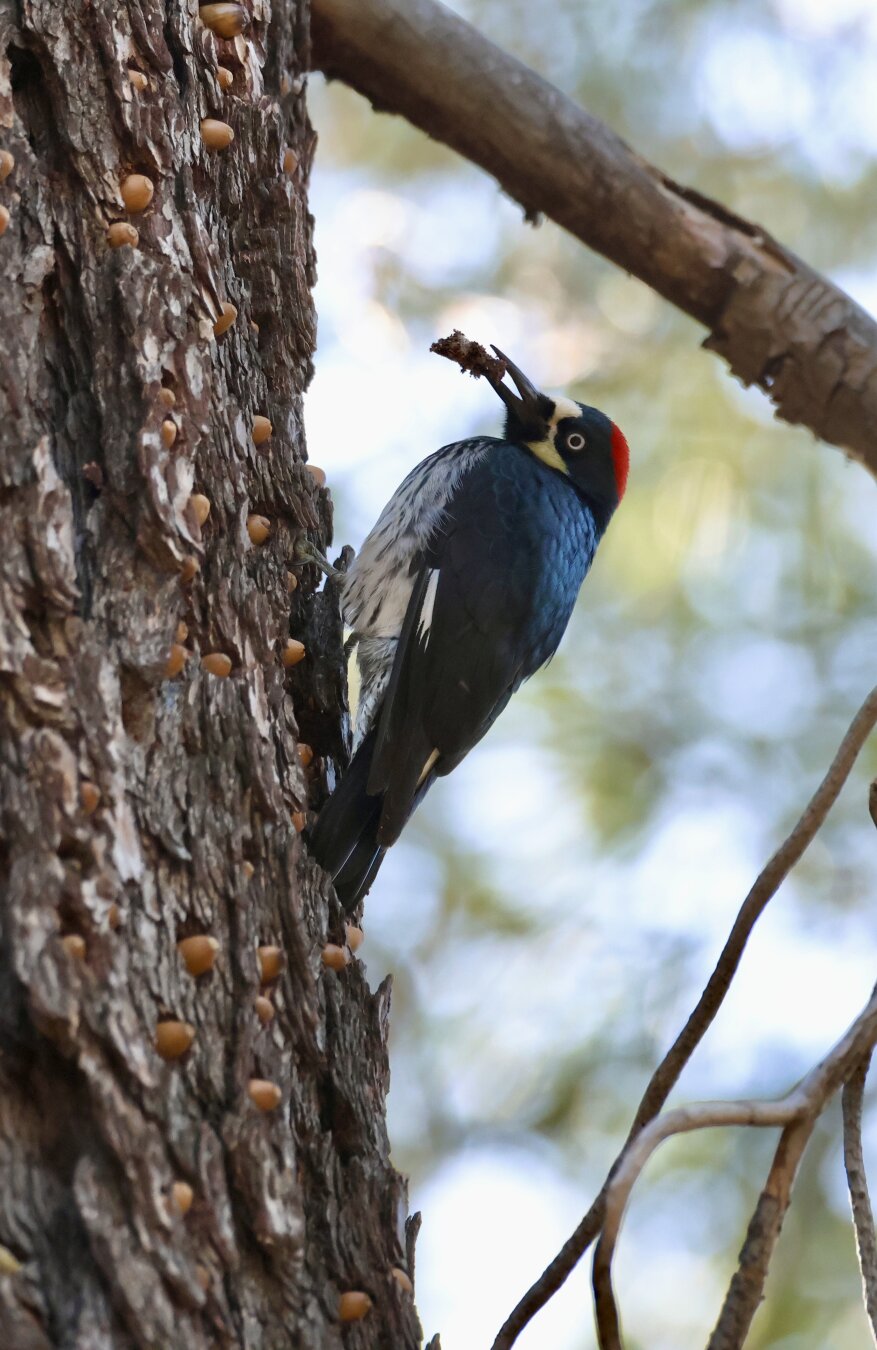 Acorn Woodpecker admires her well-stocked granary.