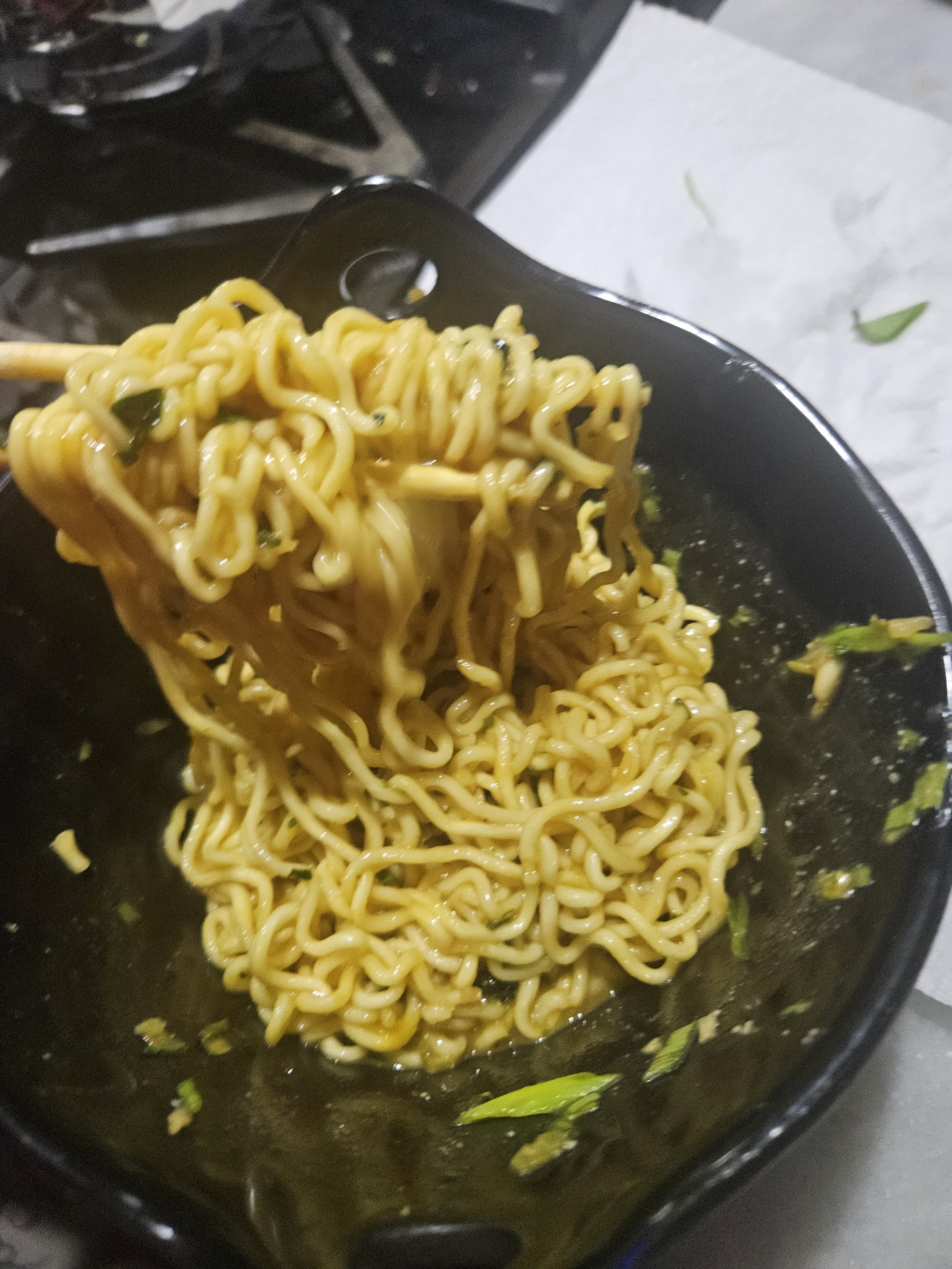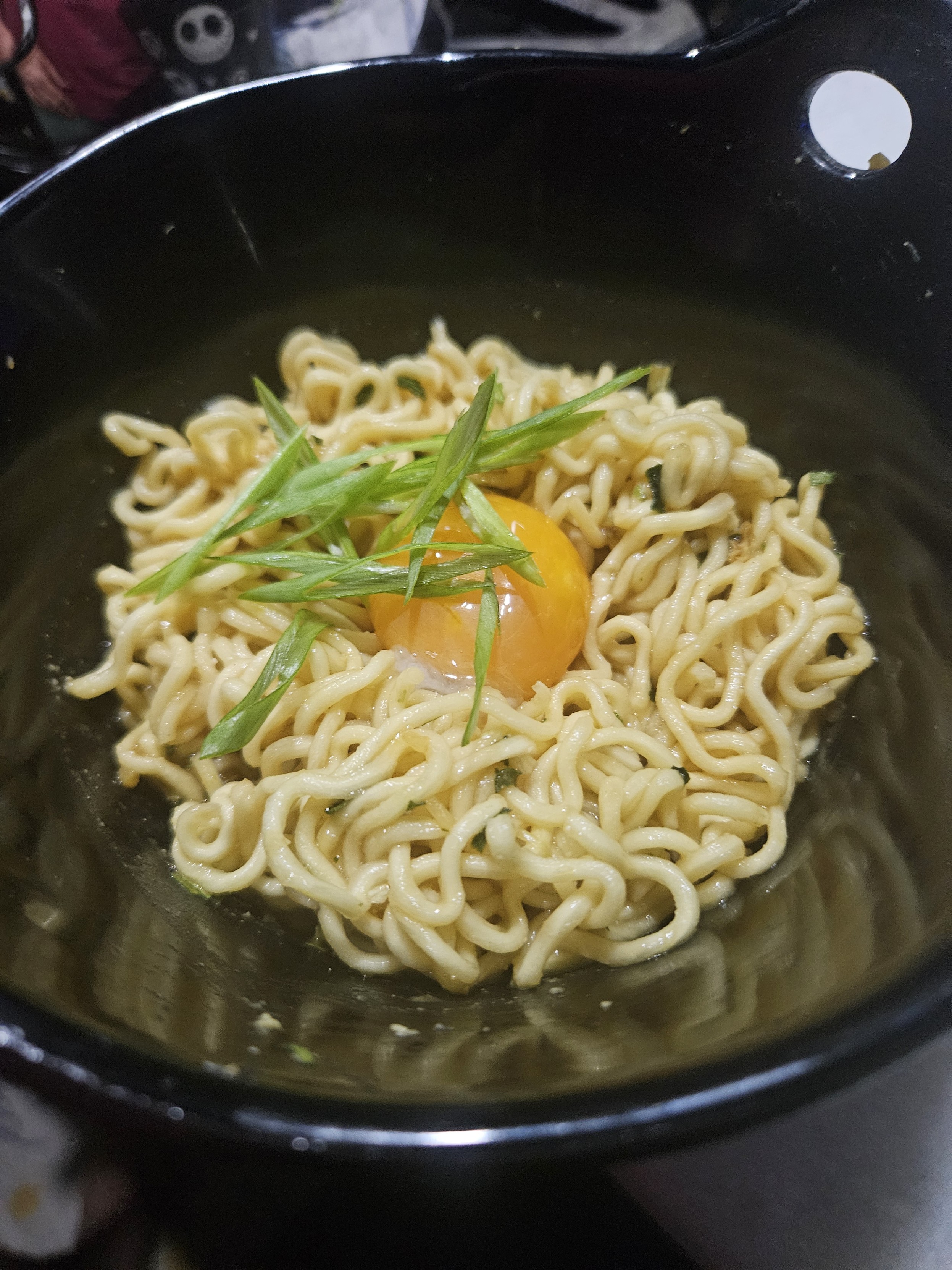 Stir the chilled noodles into the tare. Top with an egg yolk from your yard dinosaurs and fish that scallion out of the fridge drawer. Slice off some scallion threads.