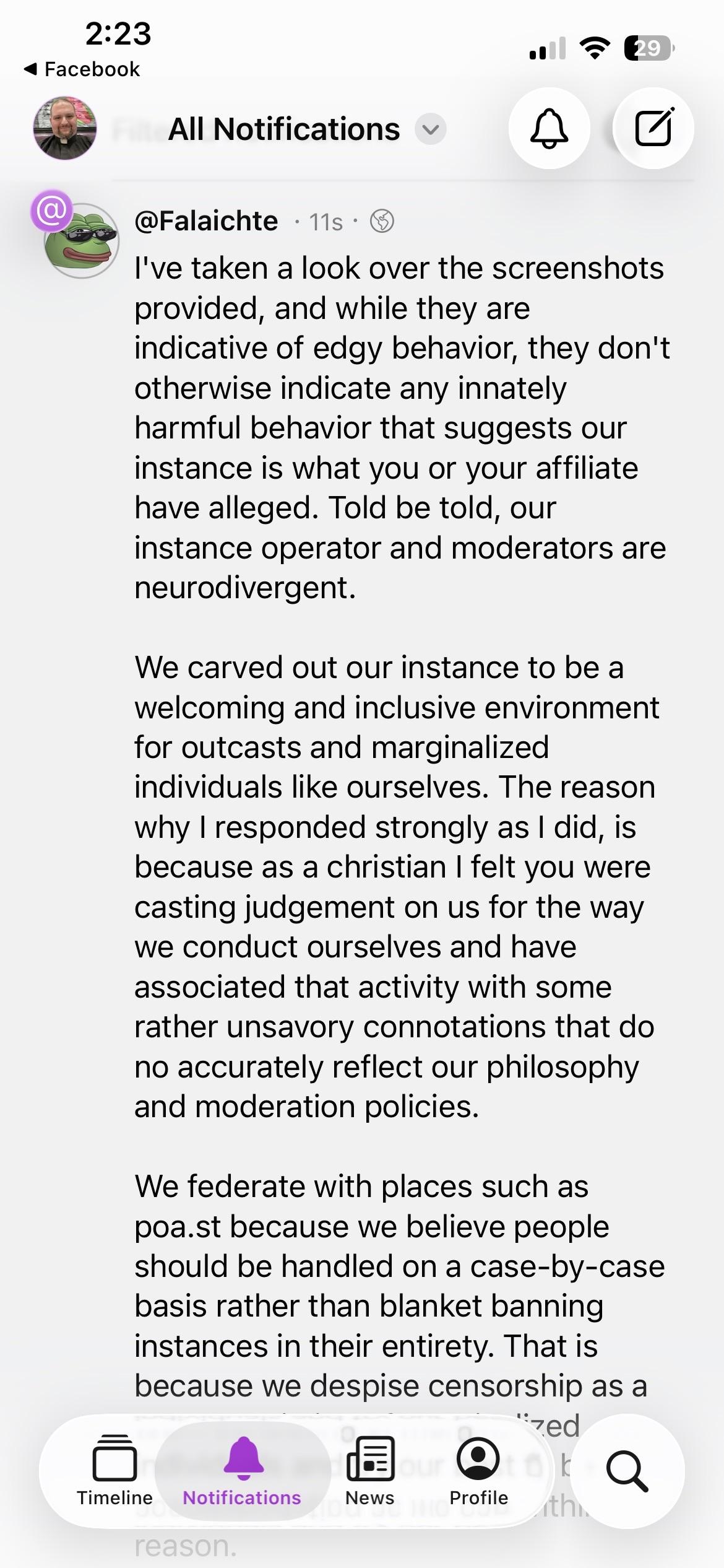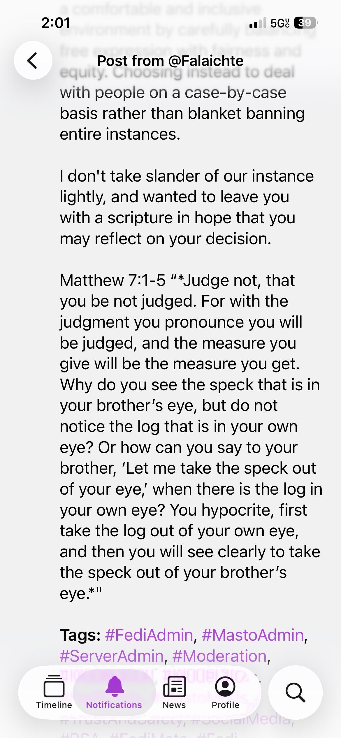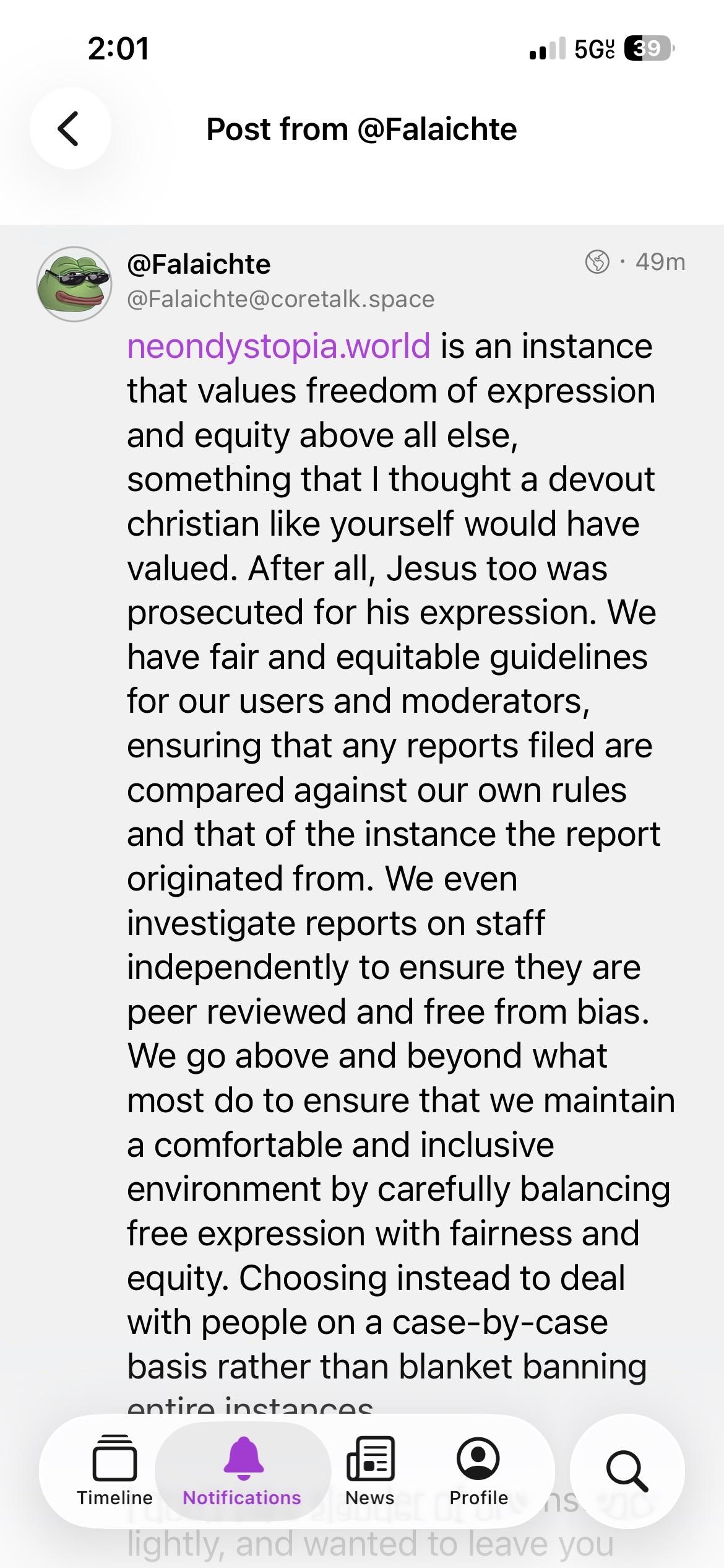 neondystopia.world is an instance that values freedom of expression and equity above all else, something that I thought a devout christian like yourself would have valued. After all, Jesus too was prosecuted for his expression. We have fair and equitable guidelines for our users and moderators, ensuring that any reports filed are compared against our own rules and that of the instance the report originated from. We even investigate reports on staff independently to ensure they are peer reviewed and free from bias. We go above and beyond what most do to ensure that we maintain a comfortable and inclusive environment by carefully balancing free expression with fairness and equity. Choosing instead to deal with people on a case-by-case basis rather than blanket banning entire instances.