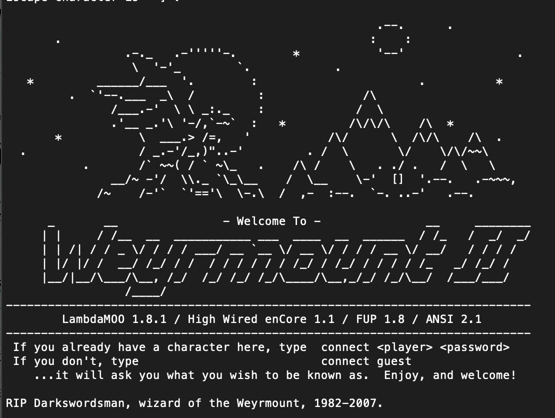 on the topic of MOOs and MUDs, i can't believe the Weyrmount MOO still exists, on the exact same port, and at the same domain i first connected to it almost 30 years ago D: