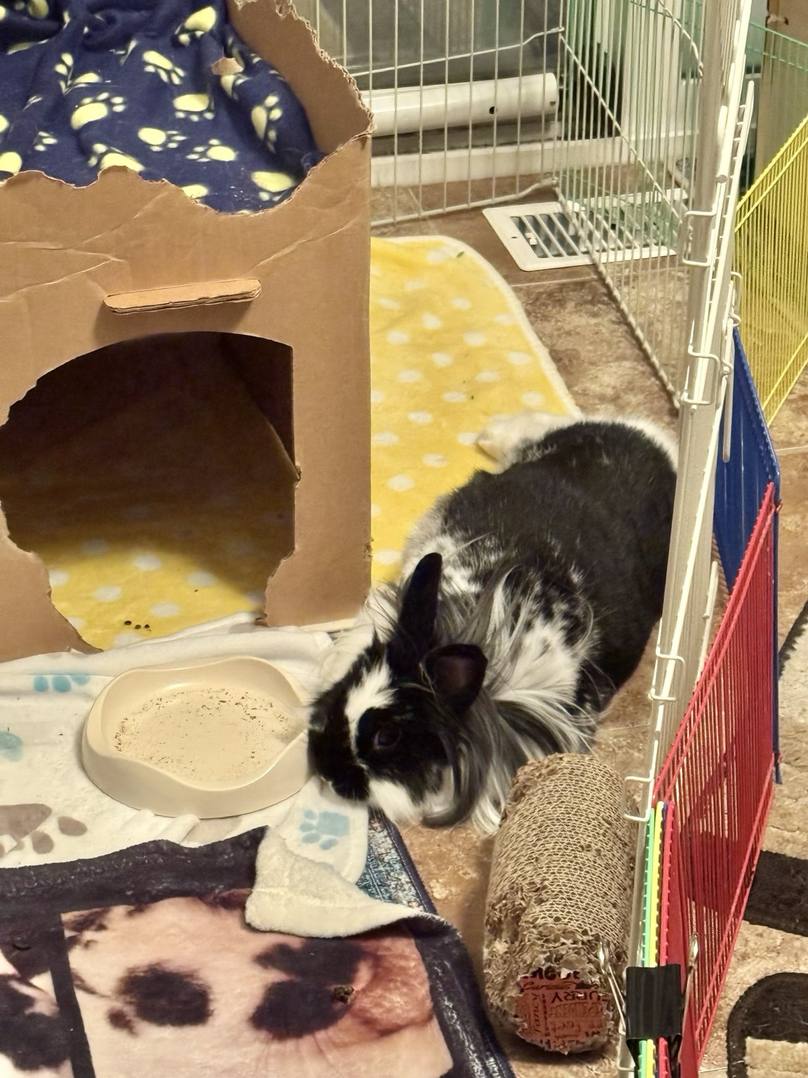 A seemingly downcast (and apparently starving) rabbit lies pointedly with nose against an empty food dish