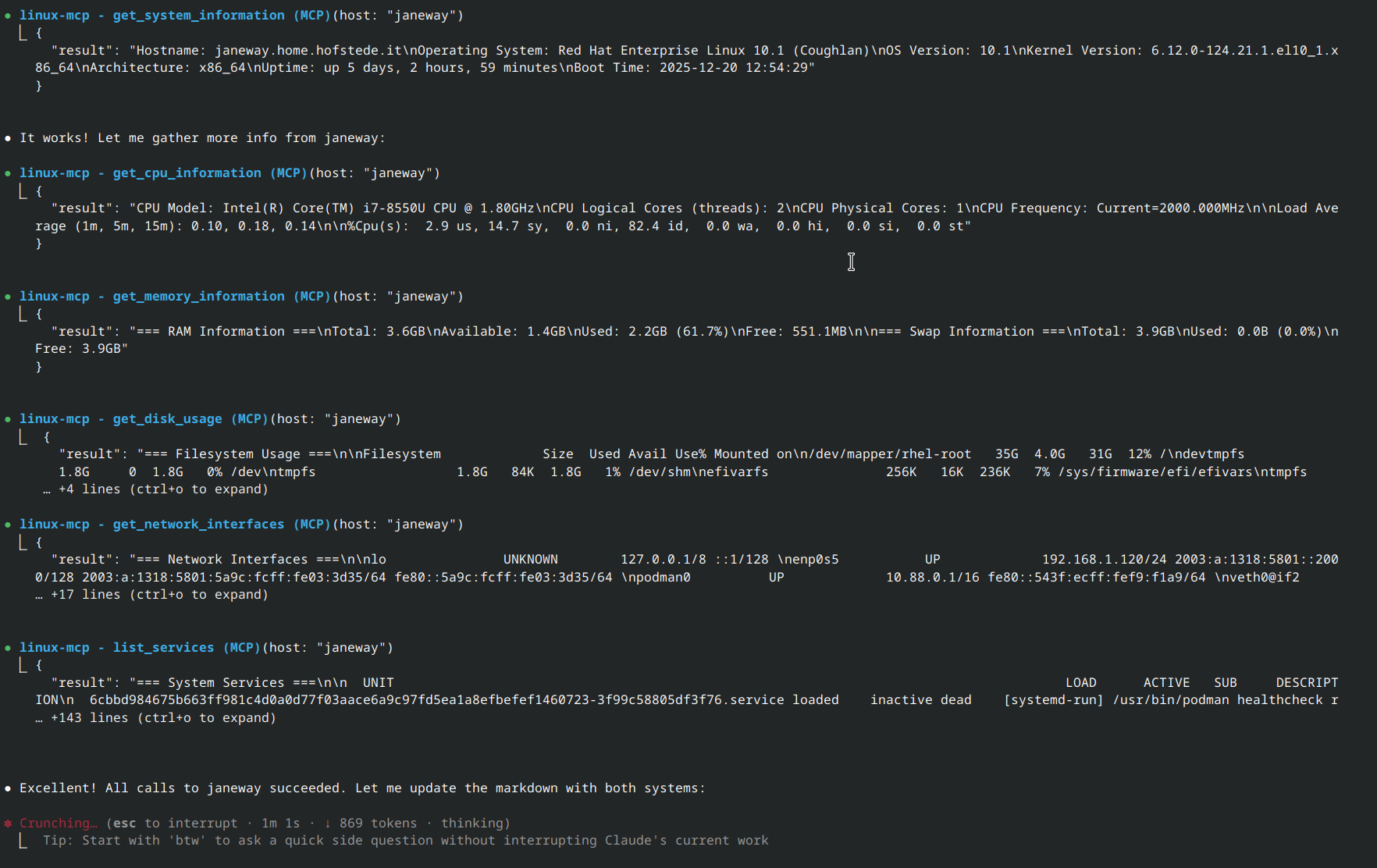 I'm testing Claude Code using the linux-mcp-server to read system information directly from my local machine.