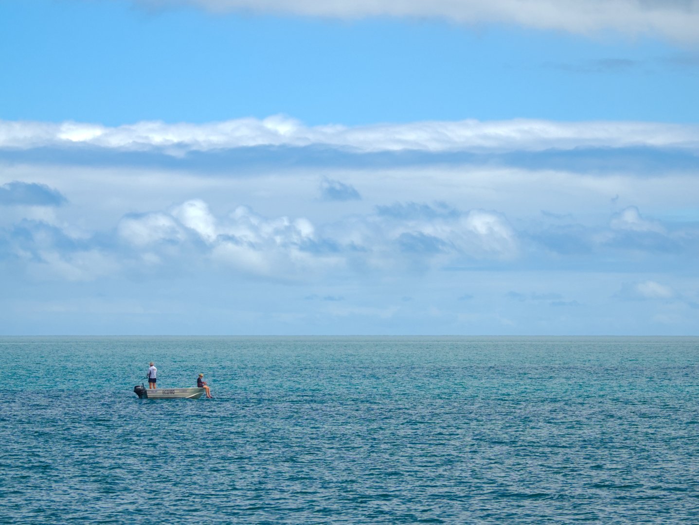 Two men in a tinny, fishing on the ocean. Nothing is visible in the photo except for the sky, the water, and the men in their boat.