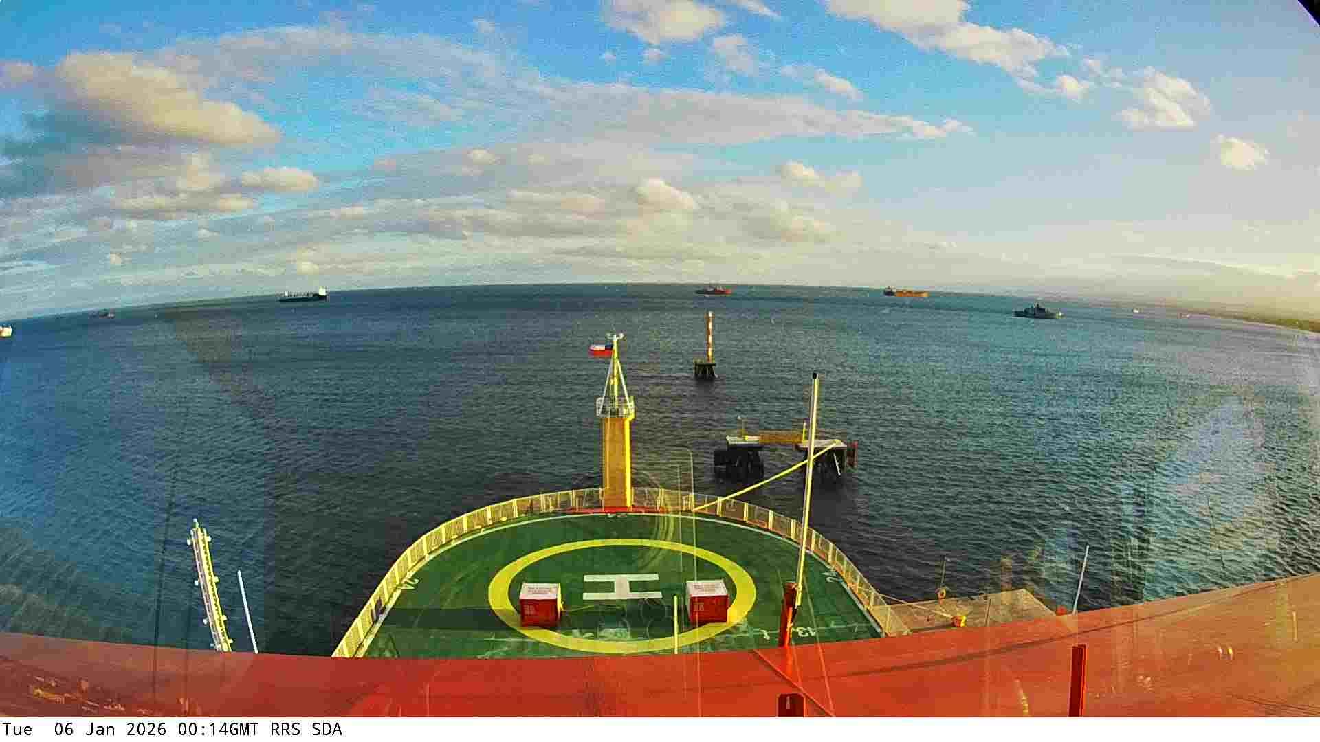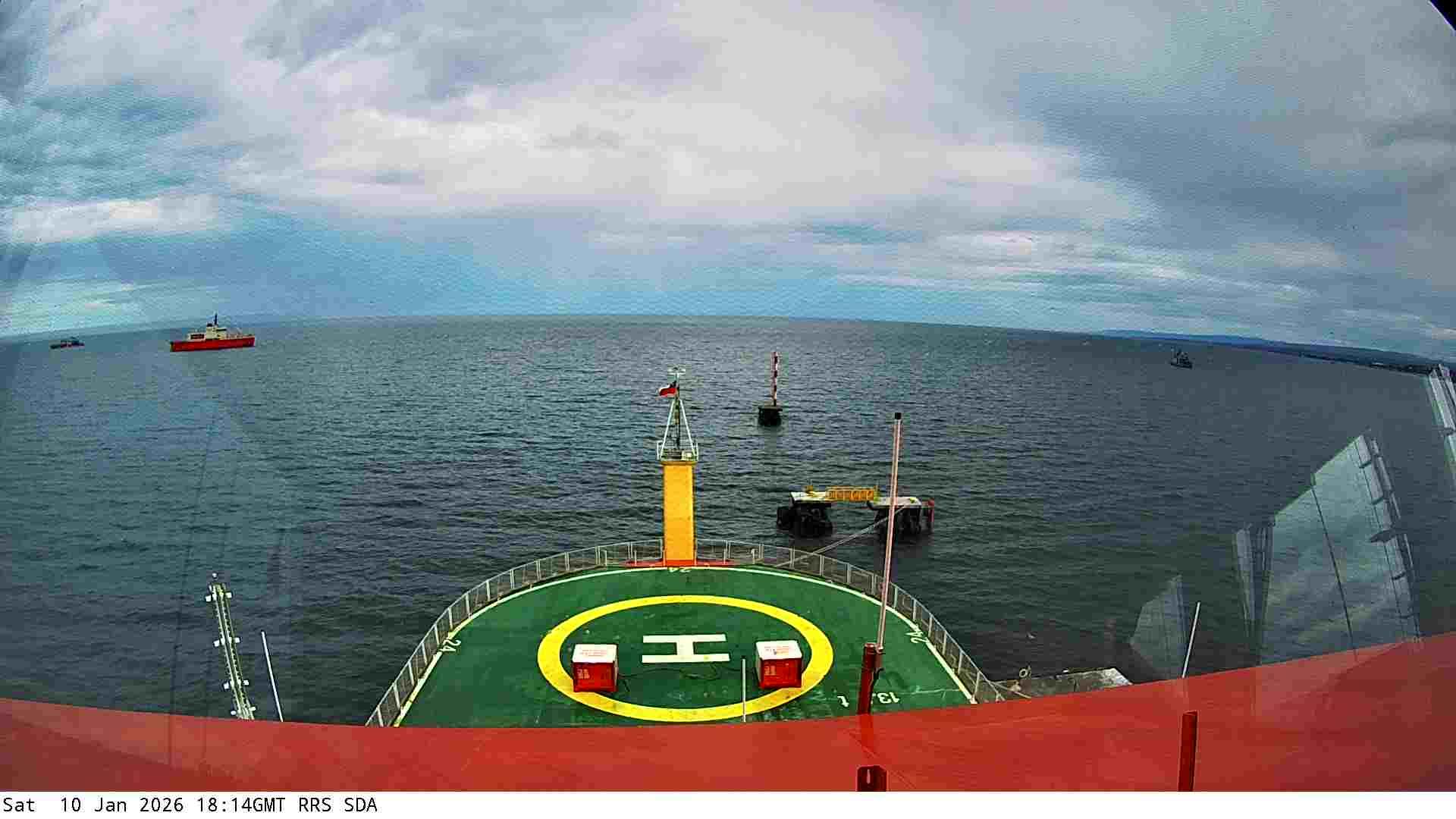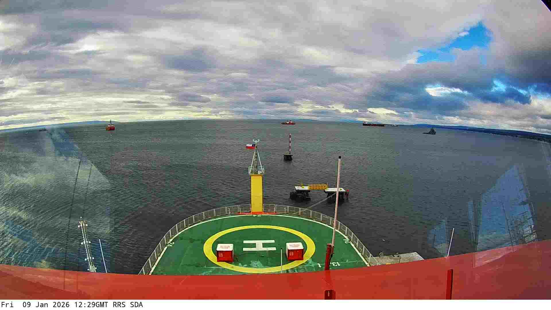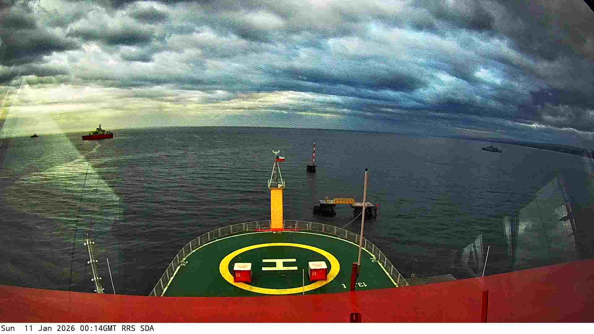 View from a webcam mounted on the RRS Sir David Attenborough boat. Typically you'd see the front of the ship with a helipad, and the sea waters surrounding the ship. Depending on the current location of the ship, the scenery may include icebergs and industrial ports.