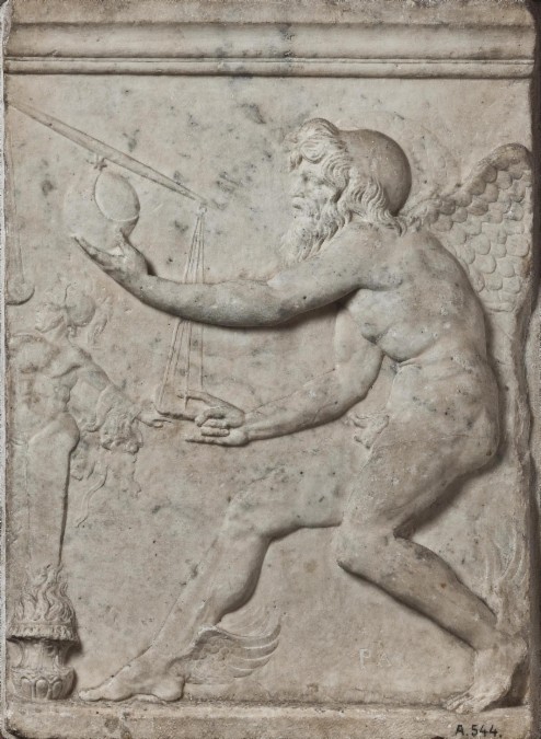 The youngest son of Zeus, he is depicted running on tiptoe with winged heels. He holds a razor in one hand and a pair of scales in the other. A lock of hair falls over the front of his face, making him easier to seize as he approaches.
