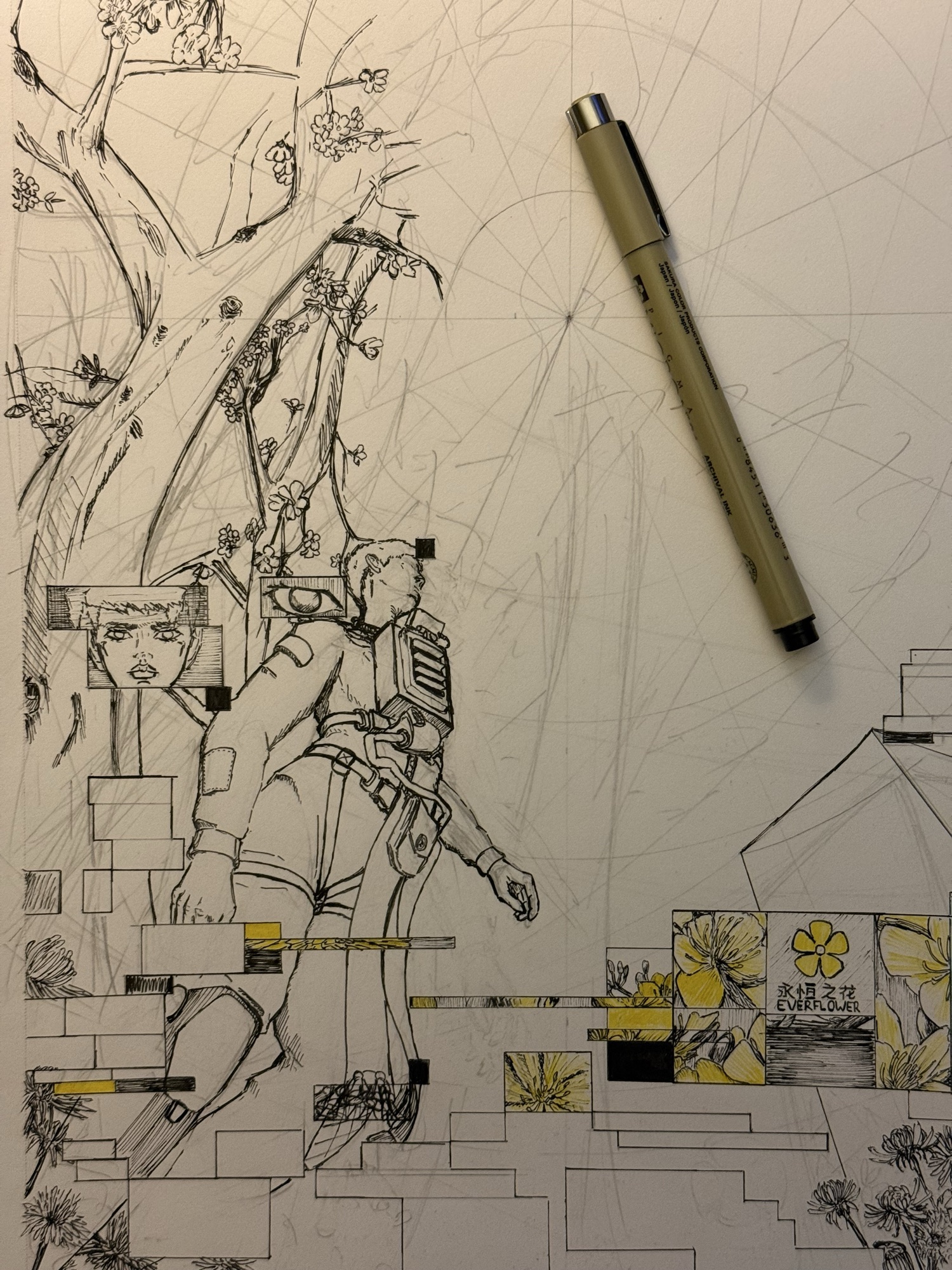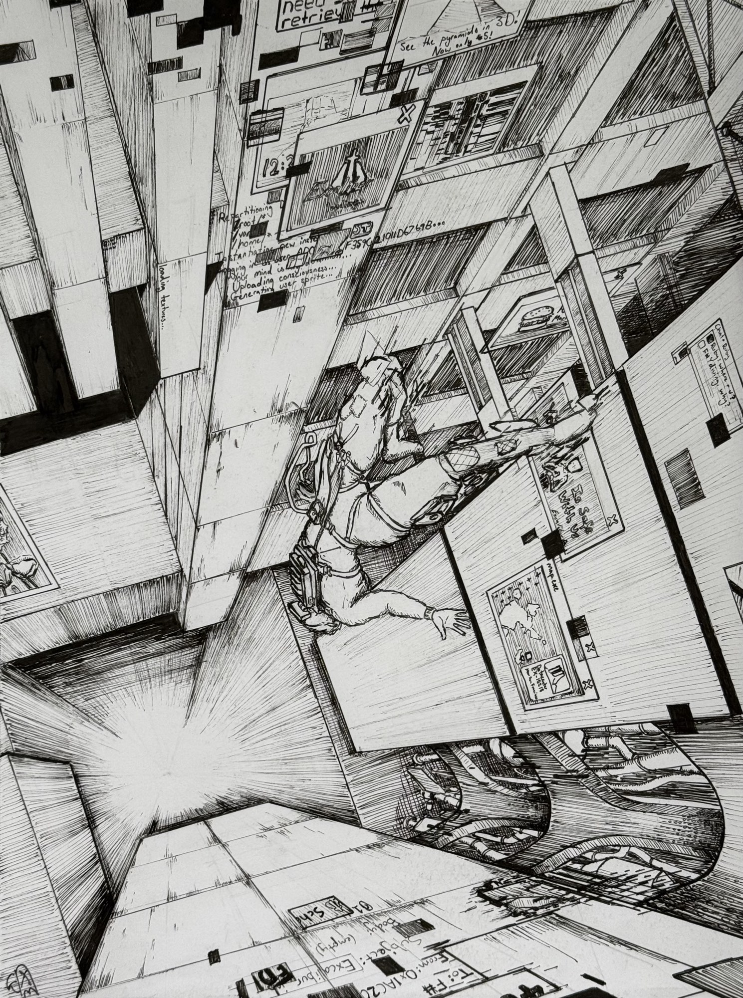 Progress as of yesterday, back at it after some new years traveling #art #oc #drawing #illustration #wip #traditionalart #inkart #sketchbook #scifiart #cyberpunkart #inkdrawing