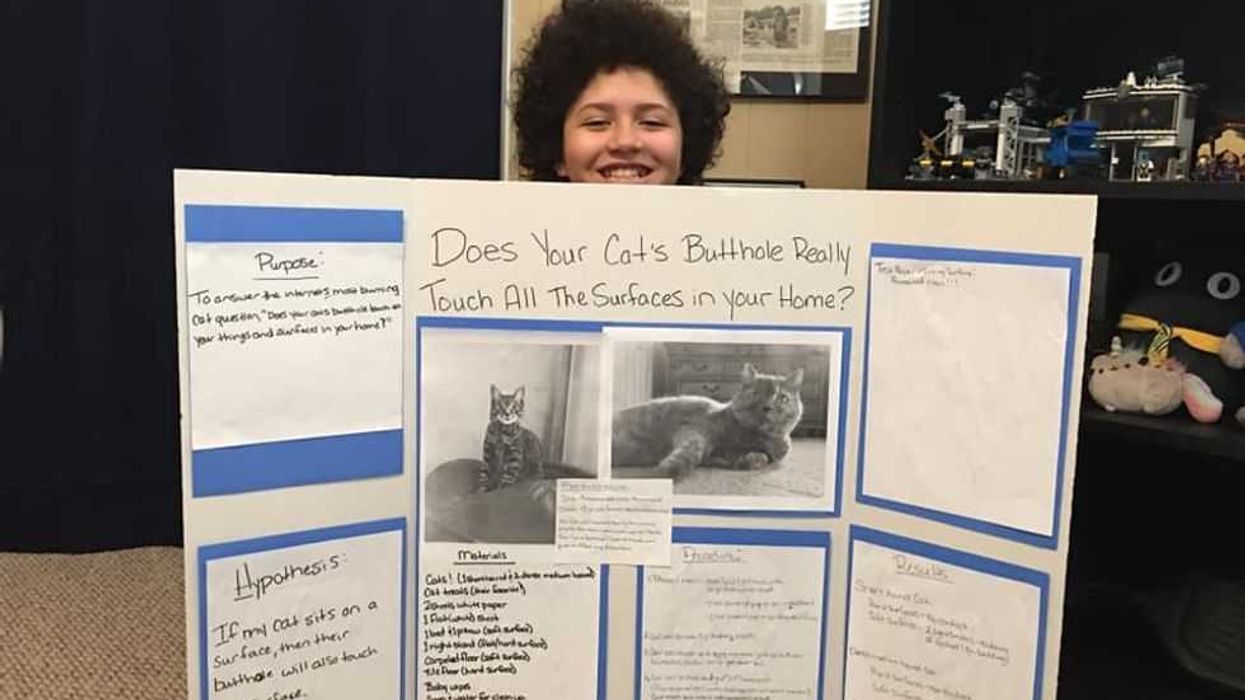 Cat owners are a special breed. Sometimes when dealing with feline friends, they have unique questions that even Google can't seem to answer. This is probably the sole reason cat forums exist, but in 2021, one kid who needed a 6th grade science project decided to skip the cat forums for answers and instead use the scientific method. Kaeden Henry, then a sixth grader, bravely pondered a question few (if any) have been brave enough to ask: do cat buttholes touch every surface they sit on?