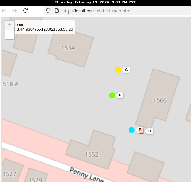 Each node transmits GPS coords every 10s, logs TX/RX to SD, and stays µs-disciplined to avoid collisions. A Semtech SX1303 sniffer on an RPi 4B captures all traffic → UDP → CSV → live web map with fading positions. Includes 49 second video (sped up 500%).
