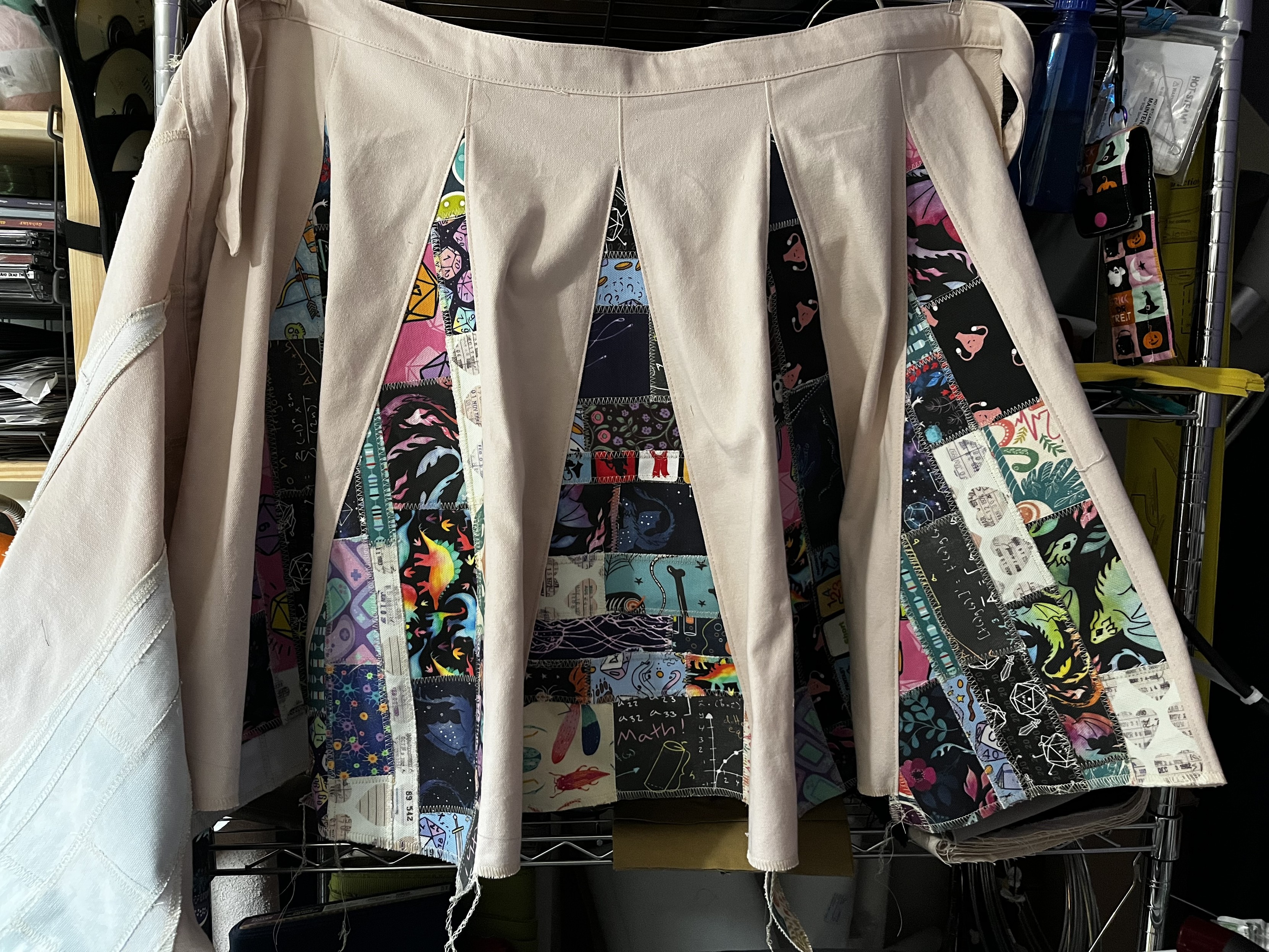 Something (almost) completely different: I had a bunch of scraps of my “hero” fabrics left over from bag making so I cut them into consistent-width strips and zigzag sewed them together, then sewed the strips together vertically (I did NOT let myself get neurotic about the same print touching itself, it was very difficult, please clap) then I did some math on an existing skirt I like and now I have a new skirt.