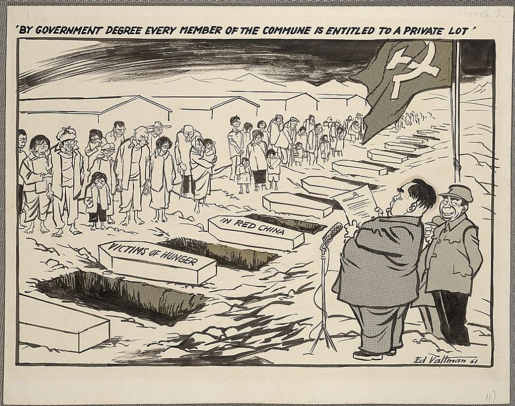 Cartoon (by Valtman, Edmund S.) shows Chinese Communist leader Mao Zedong standing behind a microphone under a flag showing the hammer and sickle, reading a proclamation to a crowd of beaten down Chinese peasants, who stand behind a row of open graves. The coffins lying next to the graves are labeled "Victims of Hunger in Red China." In 1961, after a period of disastrous weather, Communist China experienced a severe agricultural famine. The government was forced to change its policies, relaxing centralized controls of the agricultural communes and even giving the farmers the right to farm their own plots. Valtman suggests that the only plots that many Chinese will receive will be their own graves. No known restrictions on publication. For information see "Edmund S. Valtman" http://lcweb.loc.gov/rr/print/res/384_valt.html