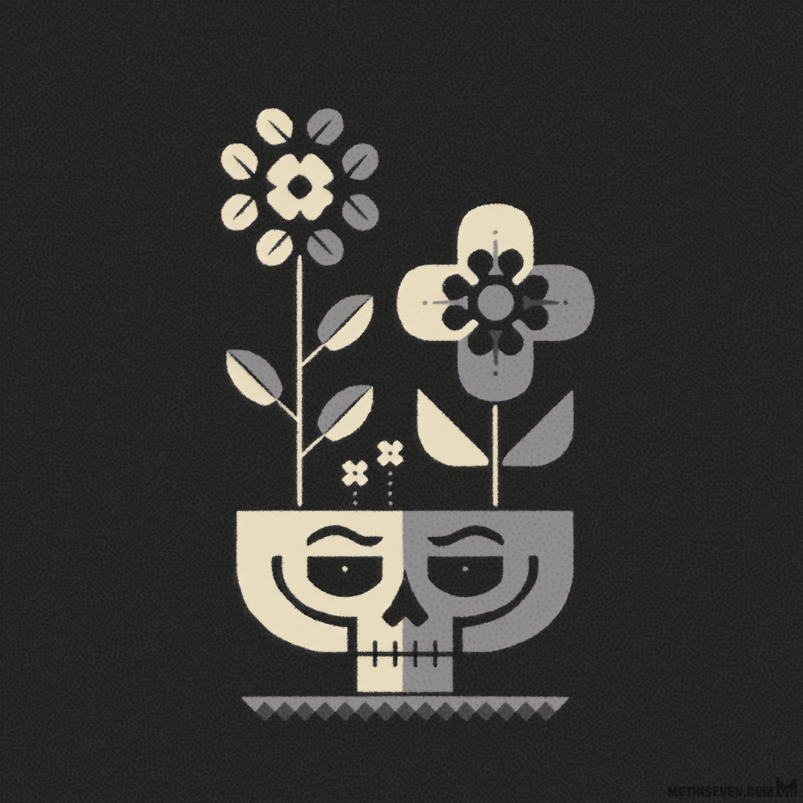 Graphic-style artwork, showing a skull as a vase, with flowers in it.