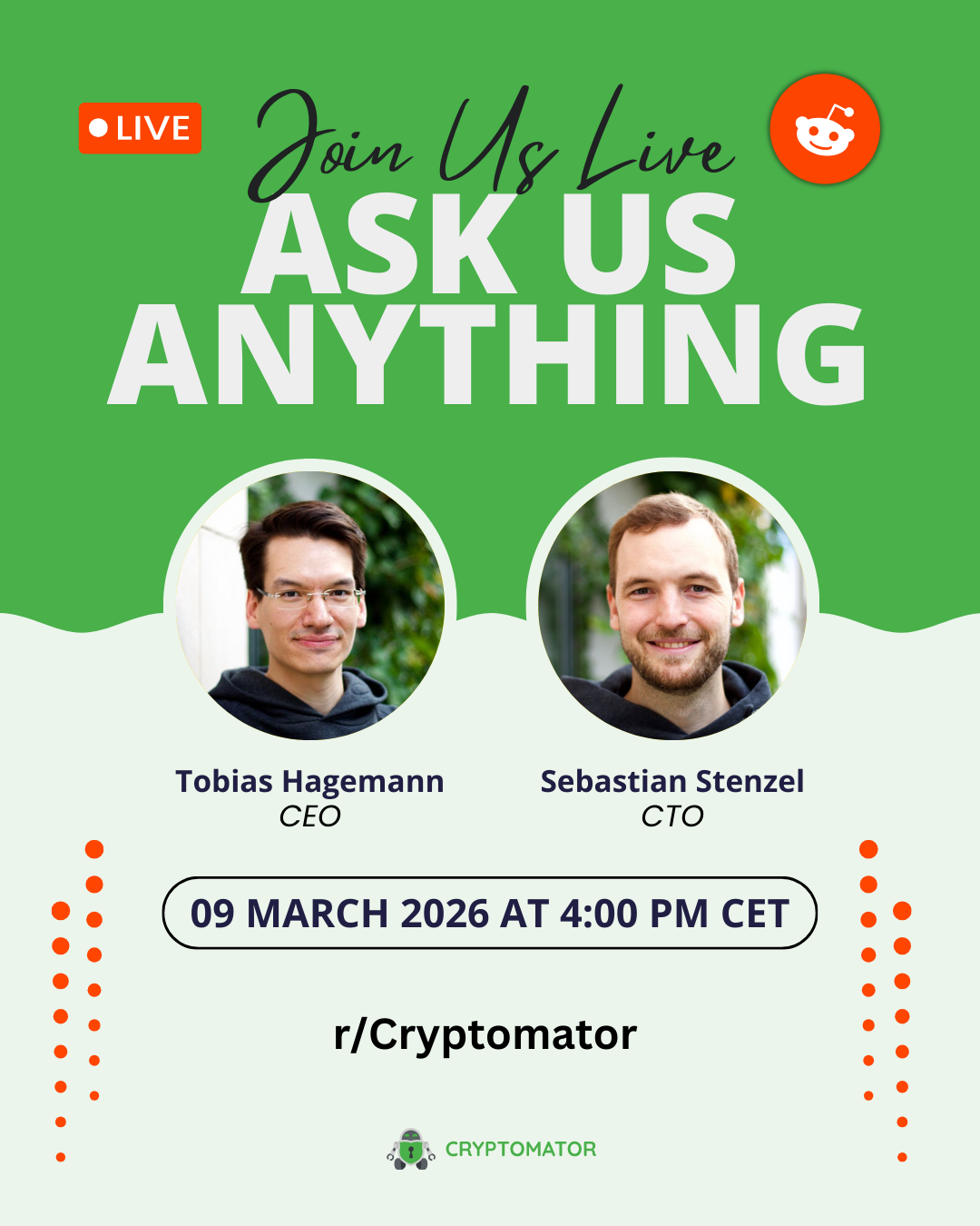 To celebrate, we’re hosting a live Reddit AMA on March 9, 2026 at 4:00 PM CET on r/Cryptomator.