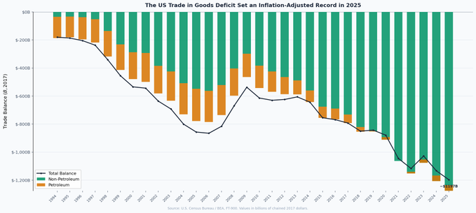 "Now here's a fun one. Per today's release from the US Census Bureau,🚨the inflation-adjusted goods trade deficit set a new record in 2025"